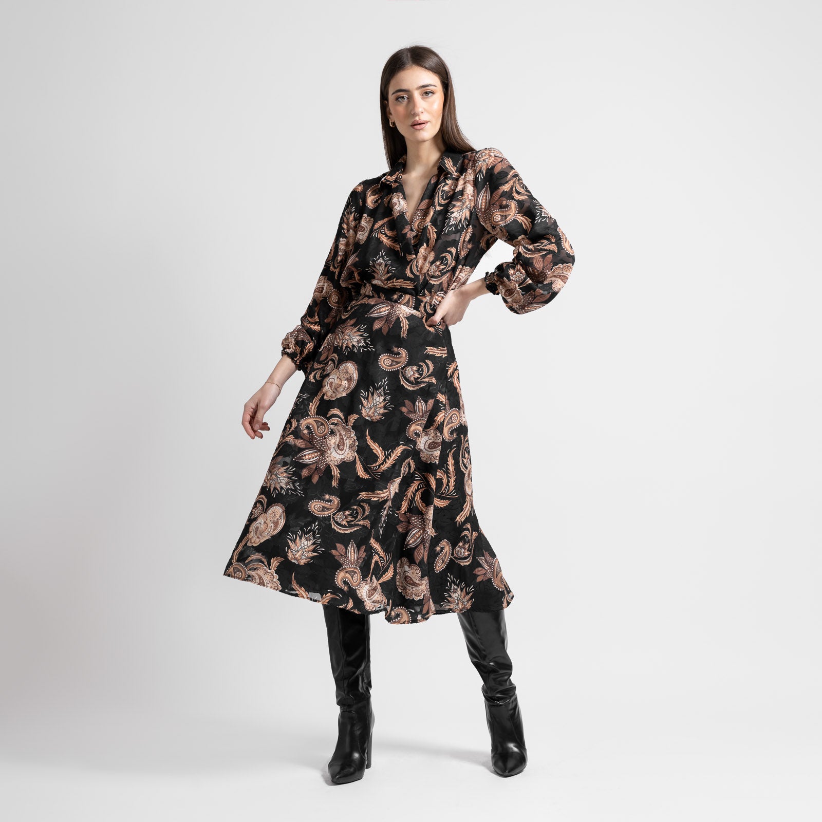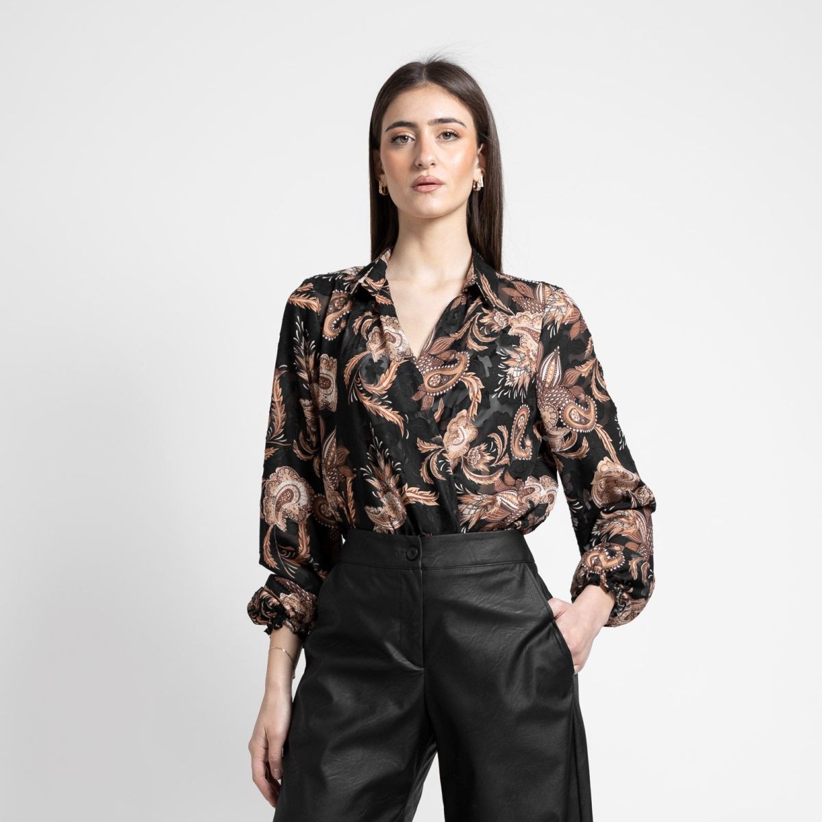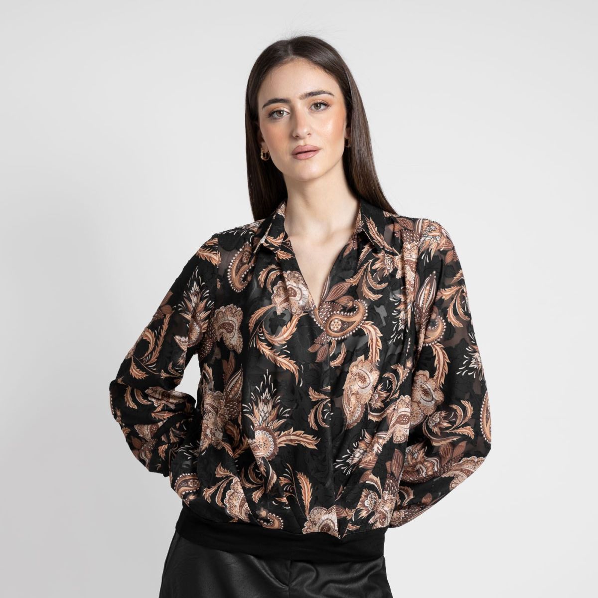 Μπλούζα σε ύφασμα διαφάνειας με ψηφιακή εκτύπωση και ανάγλυφη υφή. Συνδυάζεται με ελαστικό ύφασμα και λαστιχοκλωστή στο τελείωμα των μανικιών. 100% ελληνικής παραγωγής από το 1985.