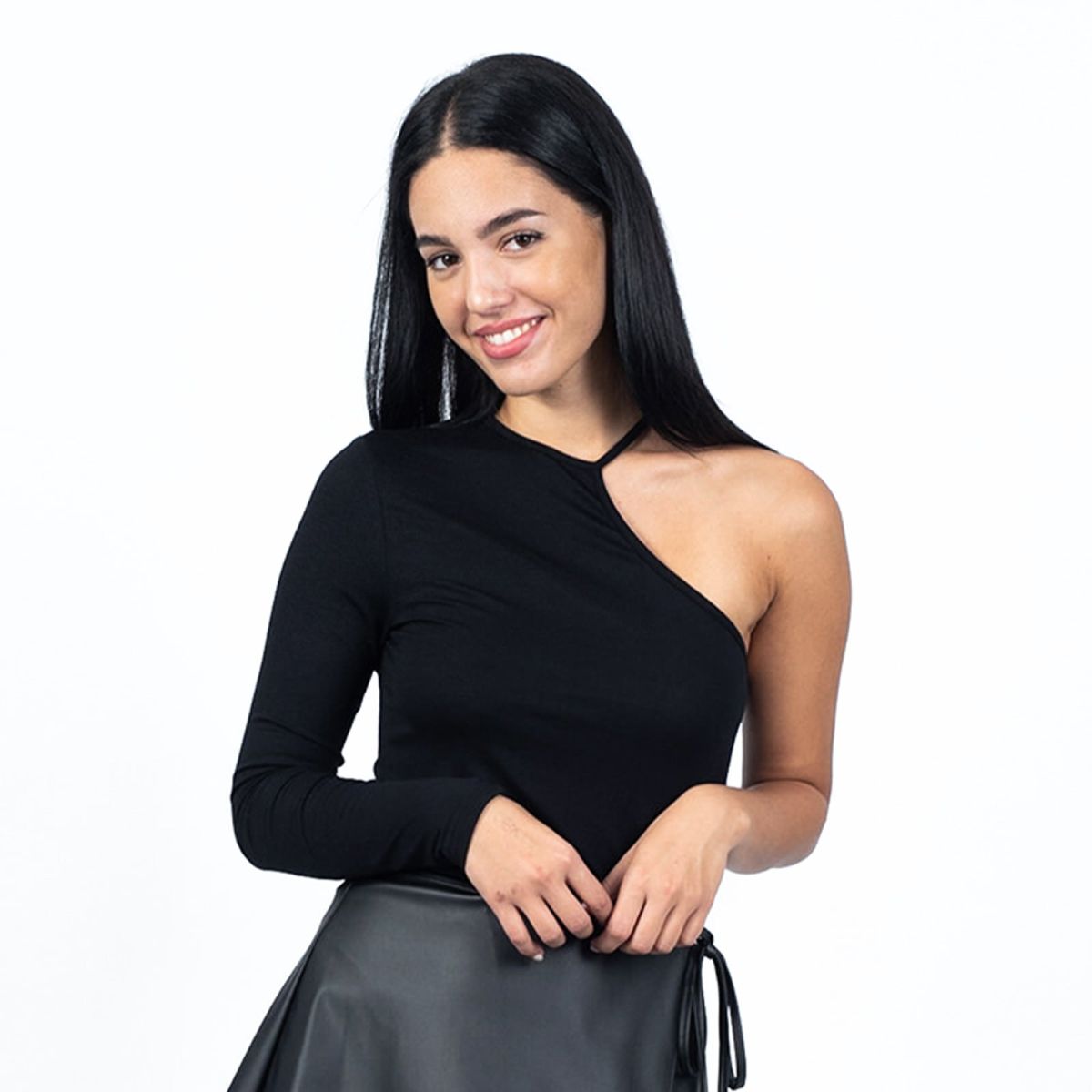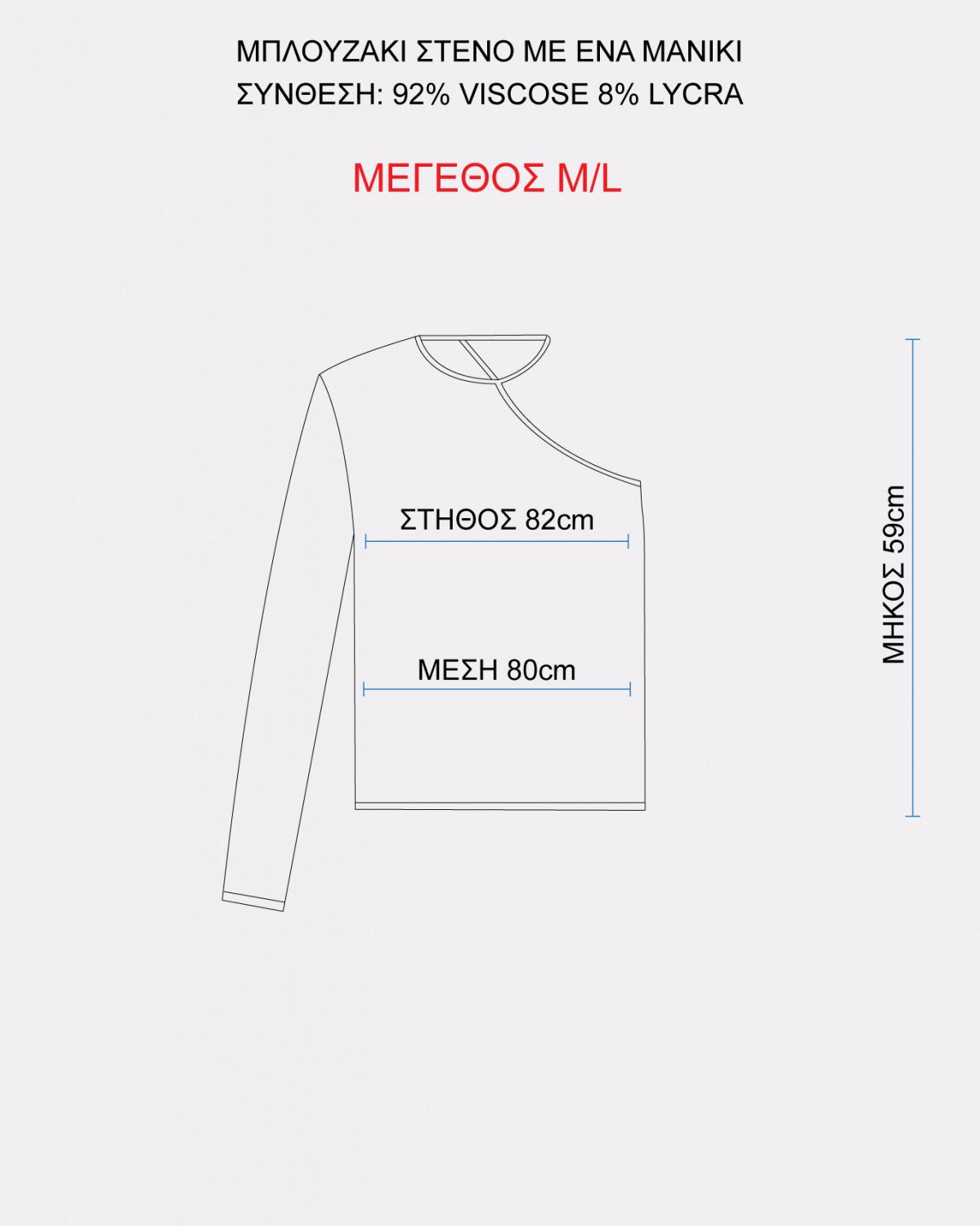 Περιγραφή:Ελαφρώς ελαστικό μπλουζάκι με έναν ώμο και ωραίο τελείωμα στο λαιμό.