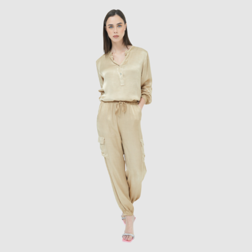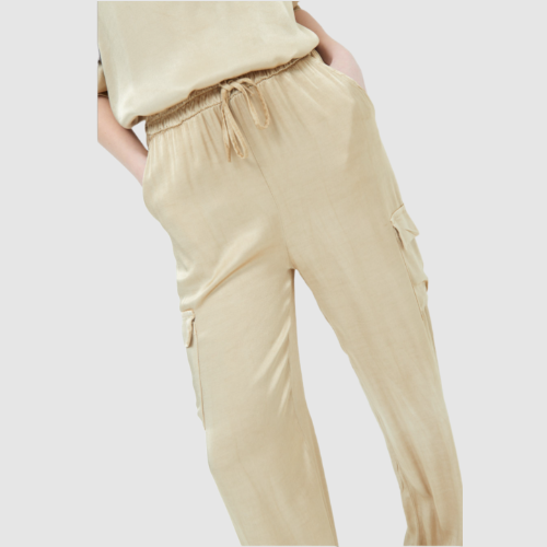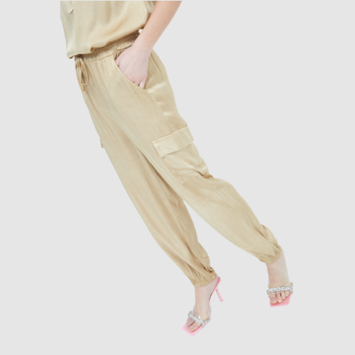 Σατέν cargo παντελόνι με πλαινές τσέπες και ελαστική μέση και αστράγαλο.