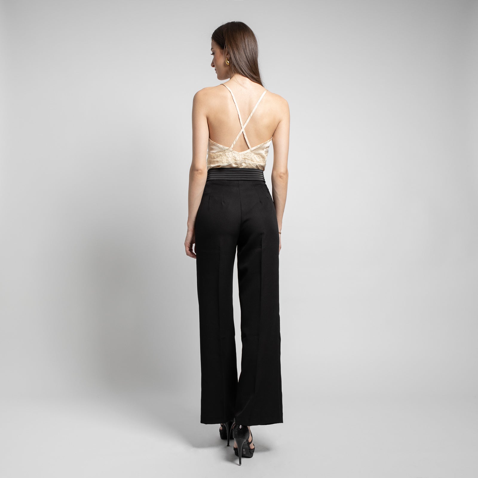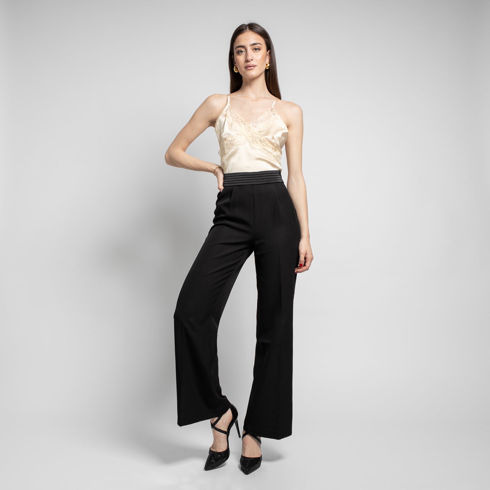Παντελόνι σε ίσια γραμμή με πιέτες και με πολύ ωραία σατέν φάσα στην μέση. Διαθέτει φερμουάρ στο πλάι.