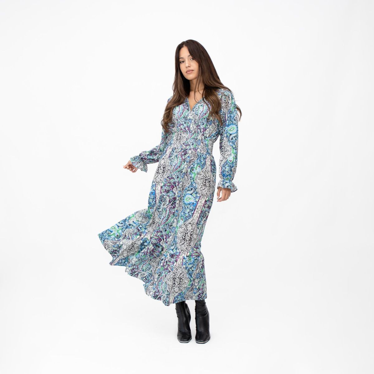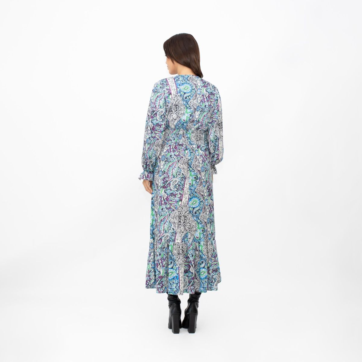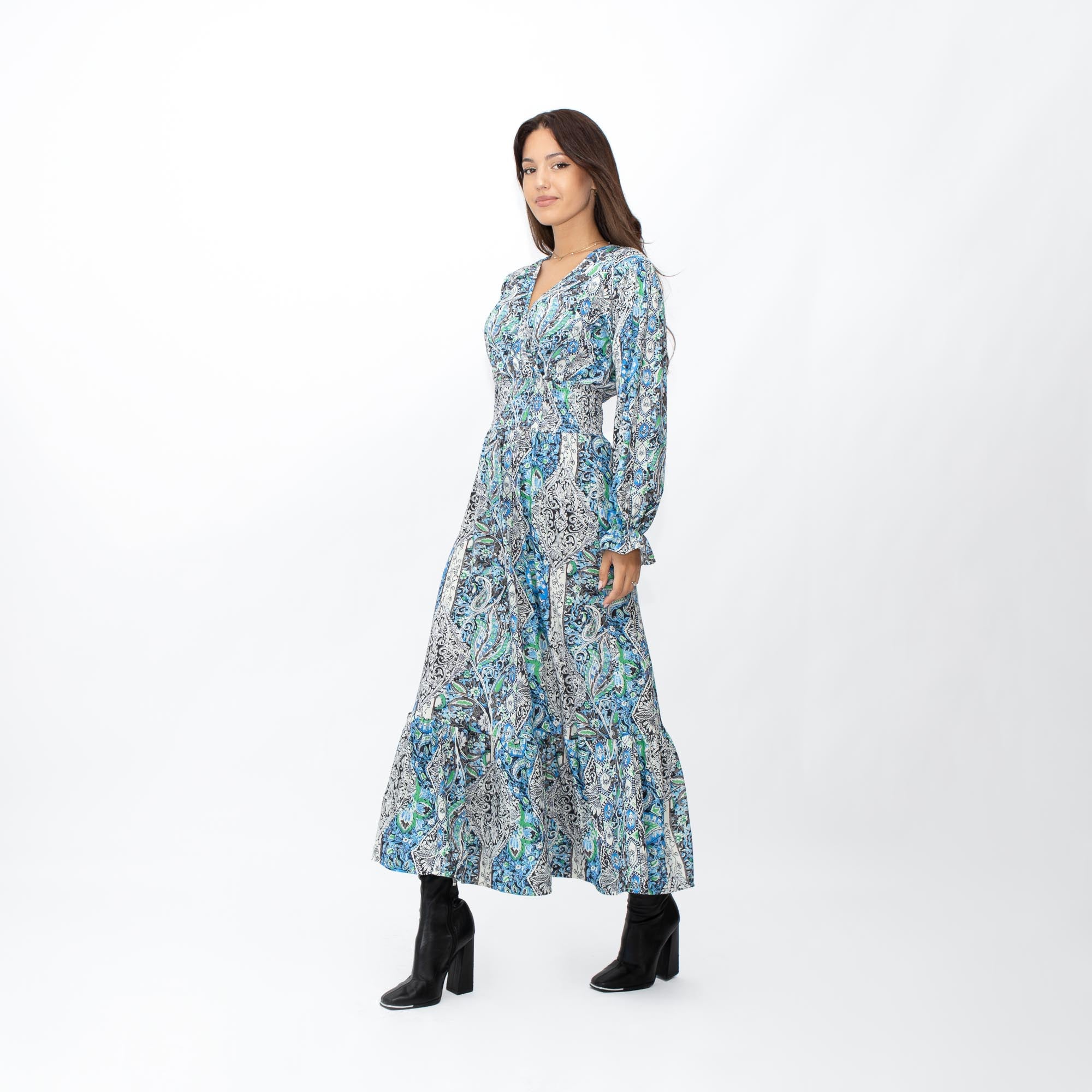 Έχει μεγάλο ντεκολτέ που καταλήγει σε φάσα με λάστιχο κάτω από το στήθος, για θηλυκή σιλουέτα.