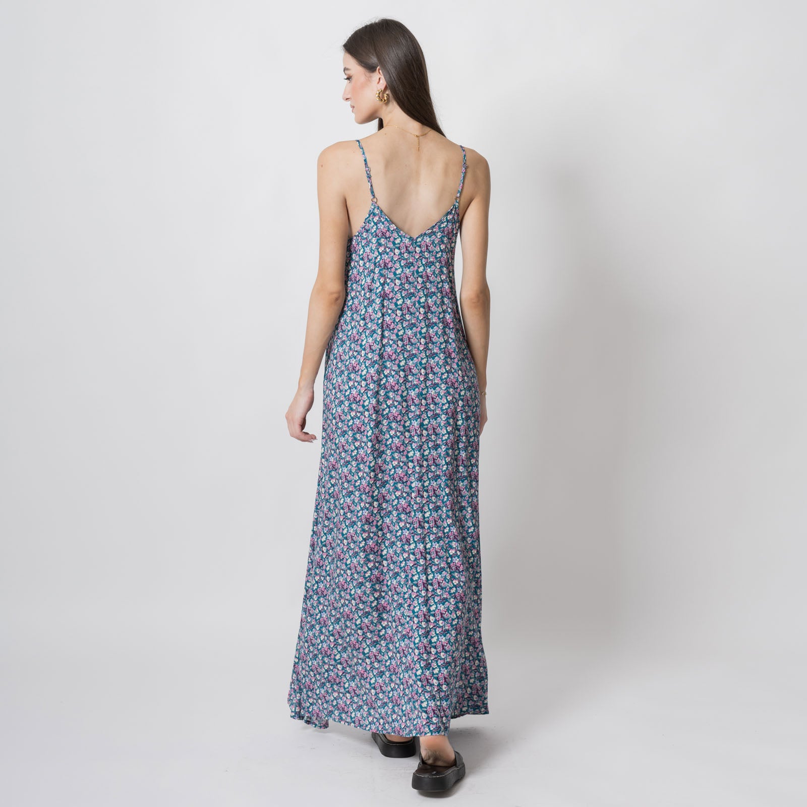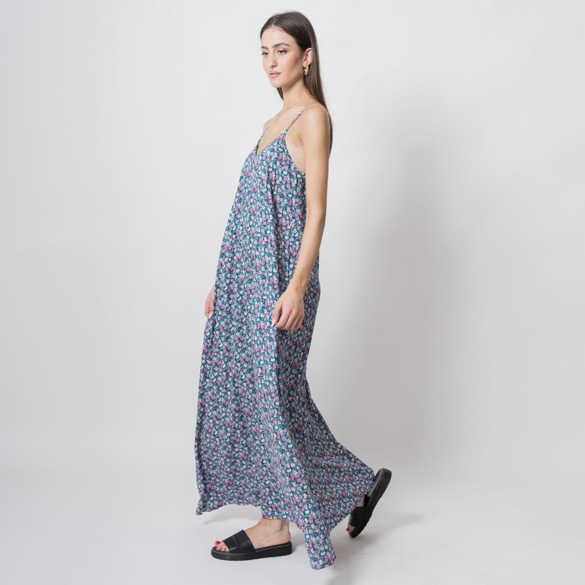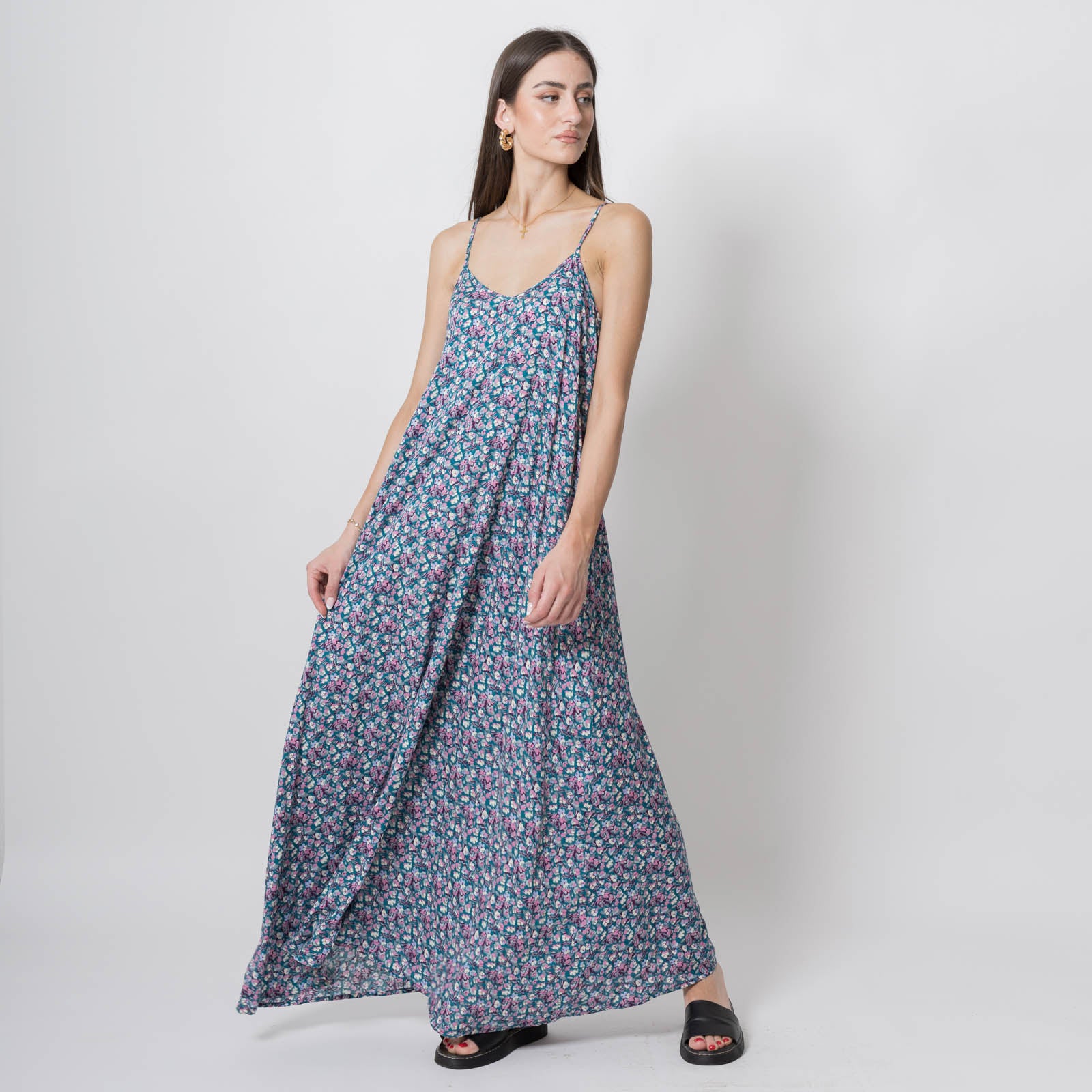 Οι λεπτές τιράντες αφήνουν ακάλυπτους τους ώμους και η maxi γραμμή χαρίζει αέρινη κίνηση. Φόρεσέ το με σανδάλια για τις πρωινές βόλτες ή με πλατφόρμες για τις απογευματινές εξόδους.