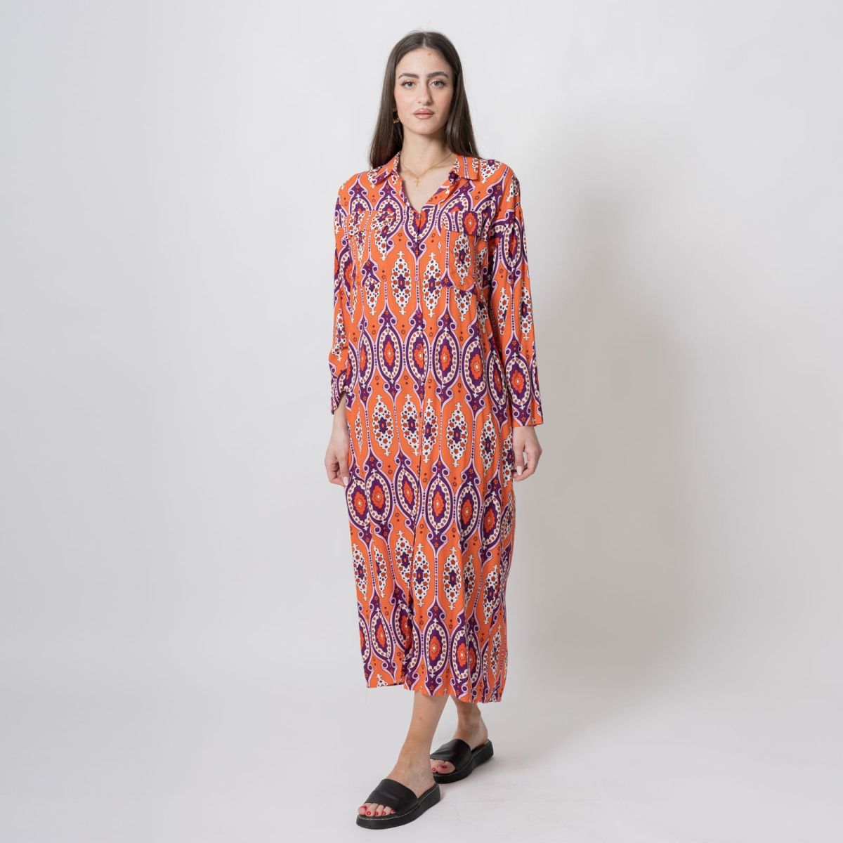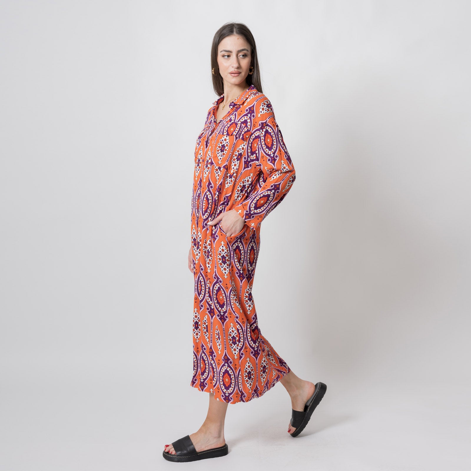 Νιώσε άνετη, κομψή και σίγουρη κάθε φορά που επιλέγεις το Φόρεμα Μακρύ Σεμιζιέ με Τσέπες Πορτοκαλί.