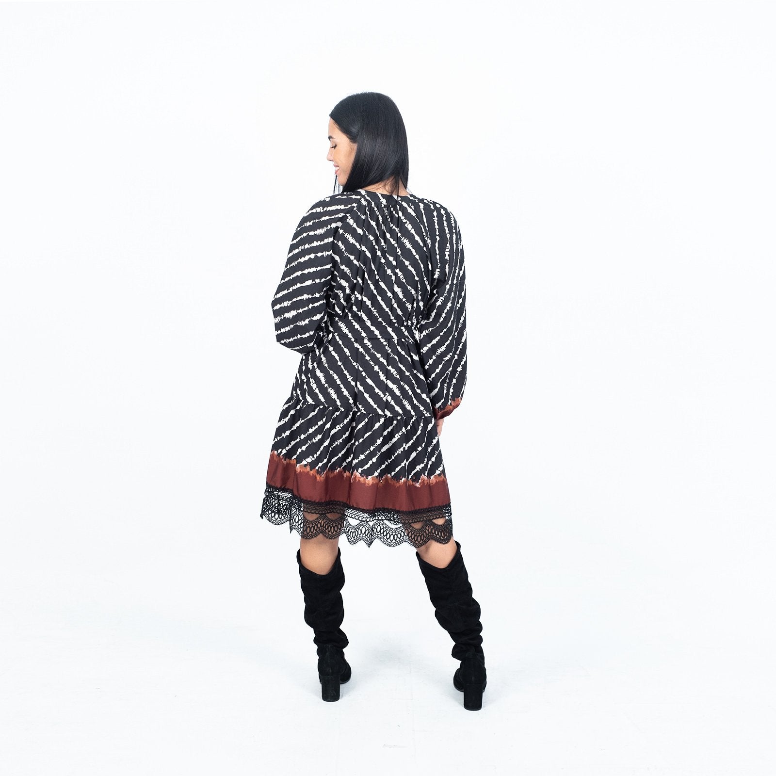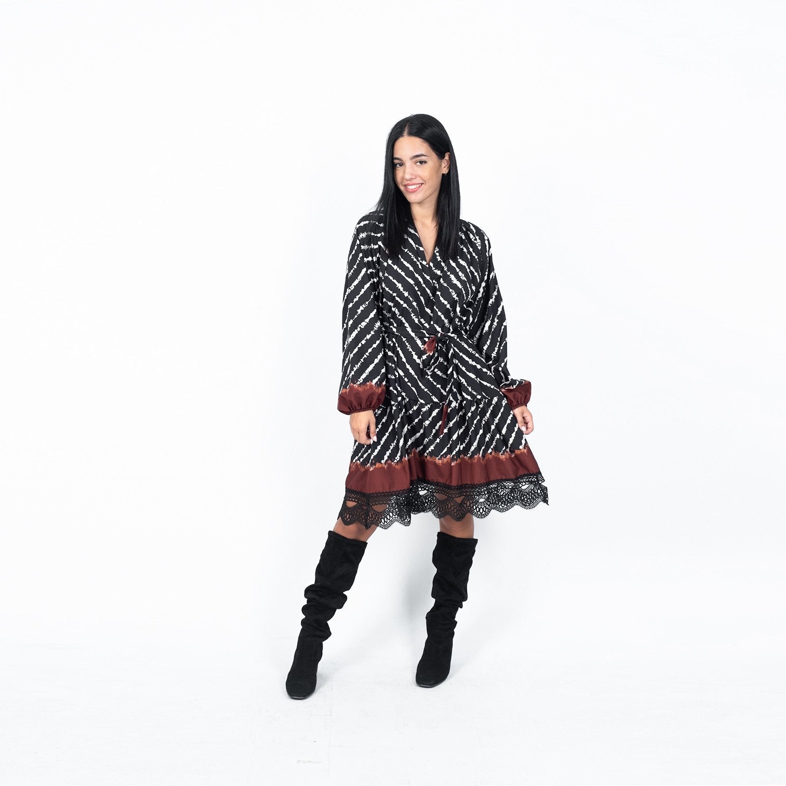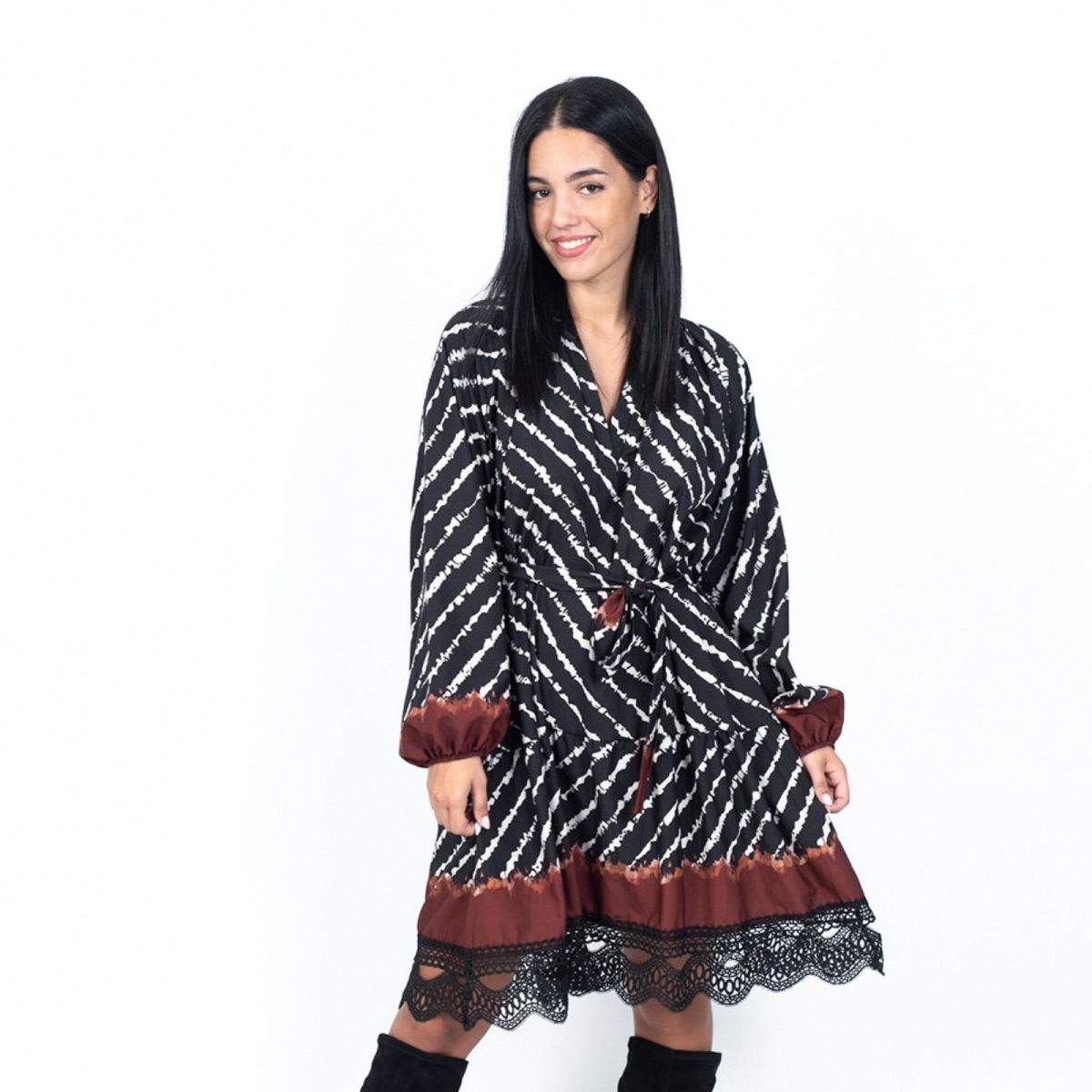 Φόρεμα midi με δαντέλα στο τελείωμα. Διαθέτει λάστιχο στα μανίκια και ζώνη στη μέση.