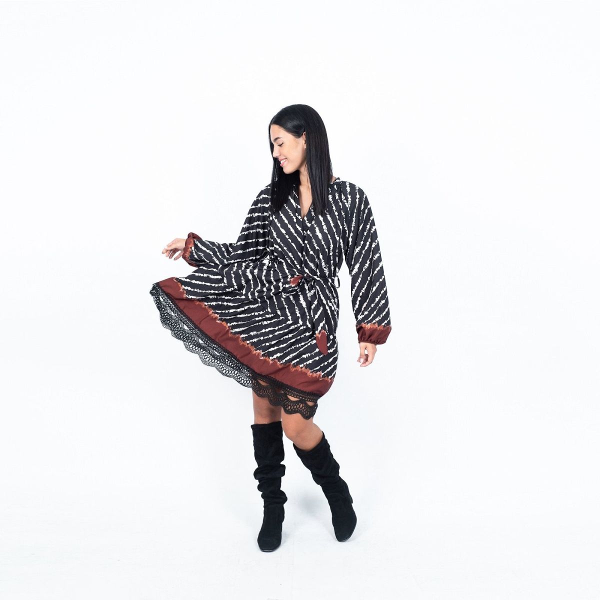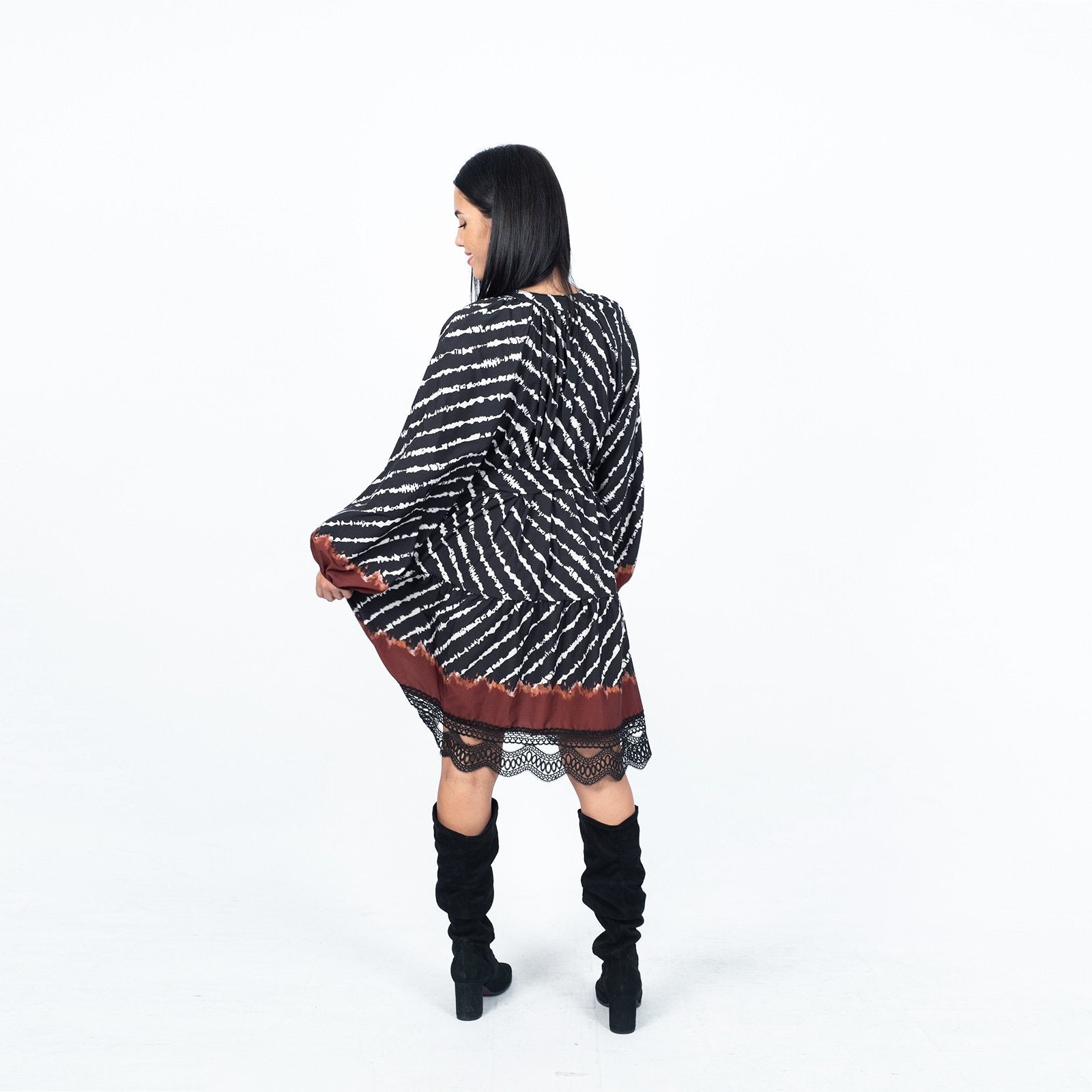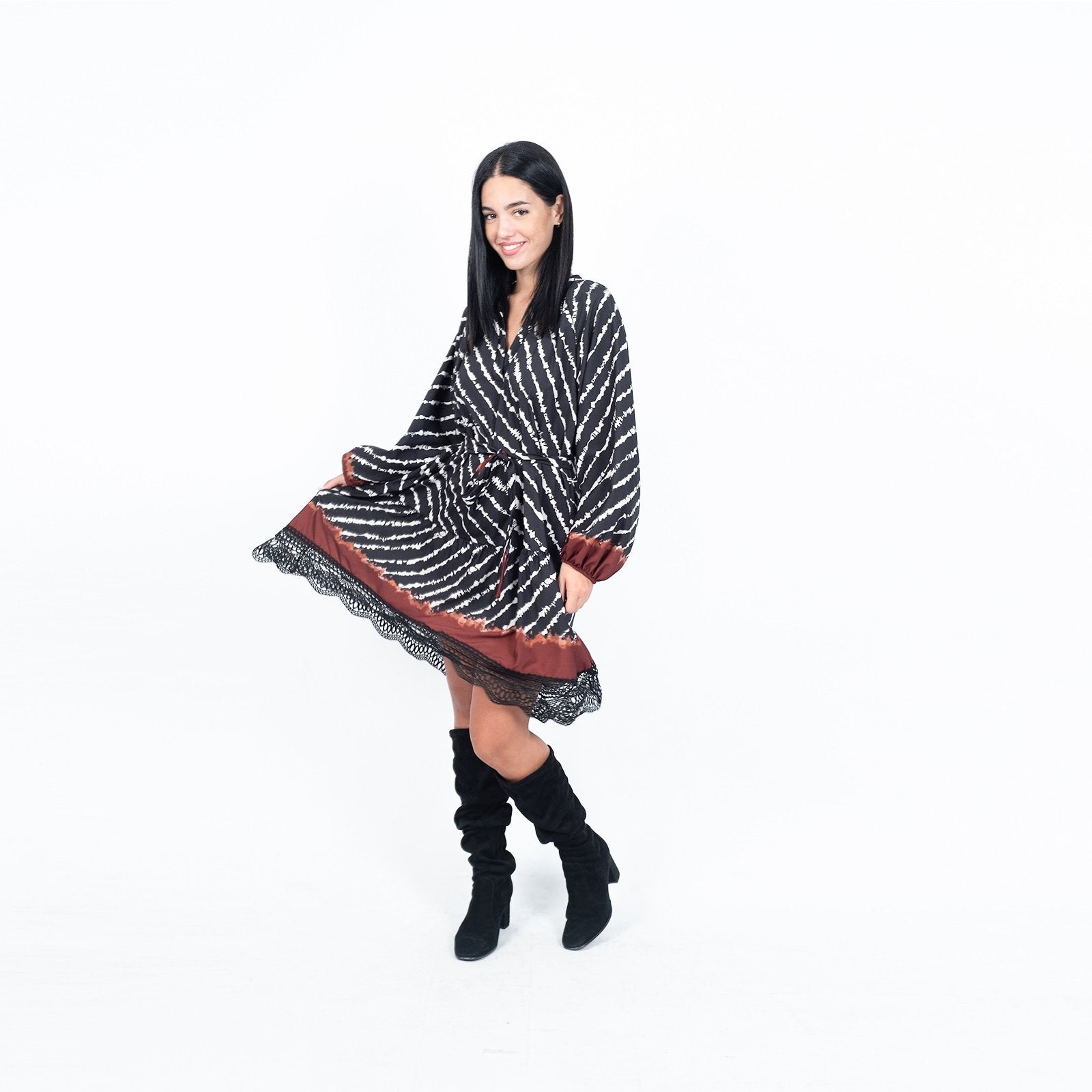Φόρεμα midi με δαντέλα στο τελείωμα. Διαθέτει λάστιχο στα μανίκια και ζώνη στη μέση.