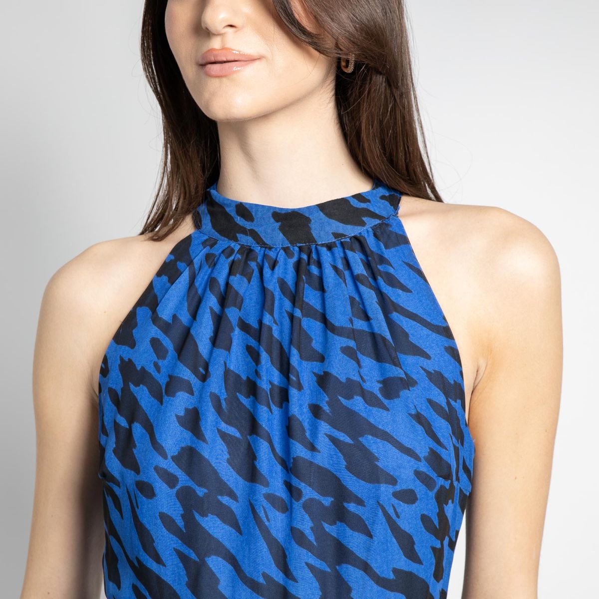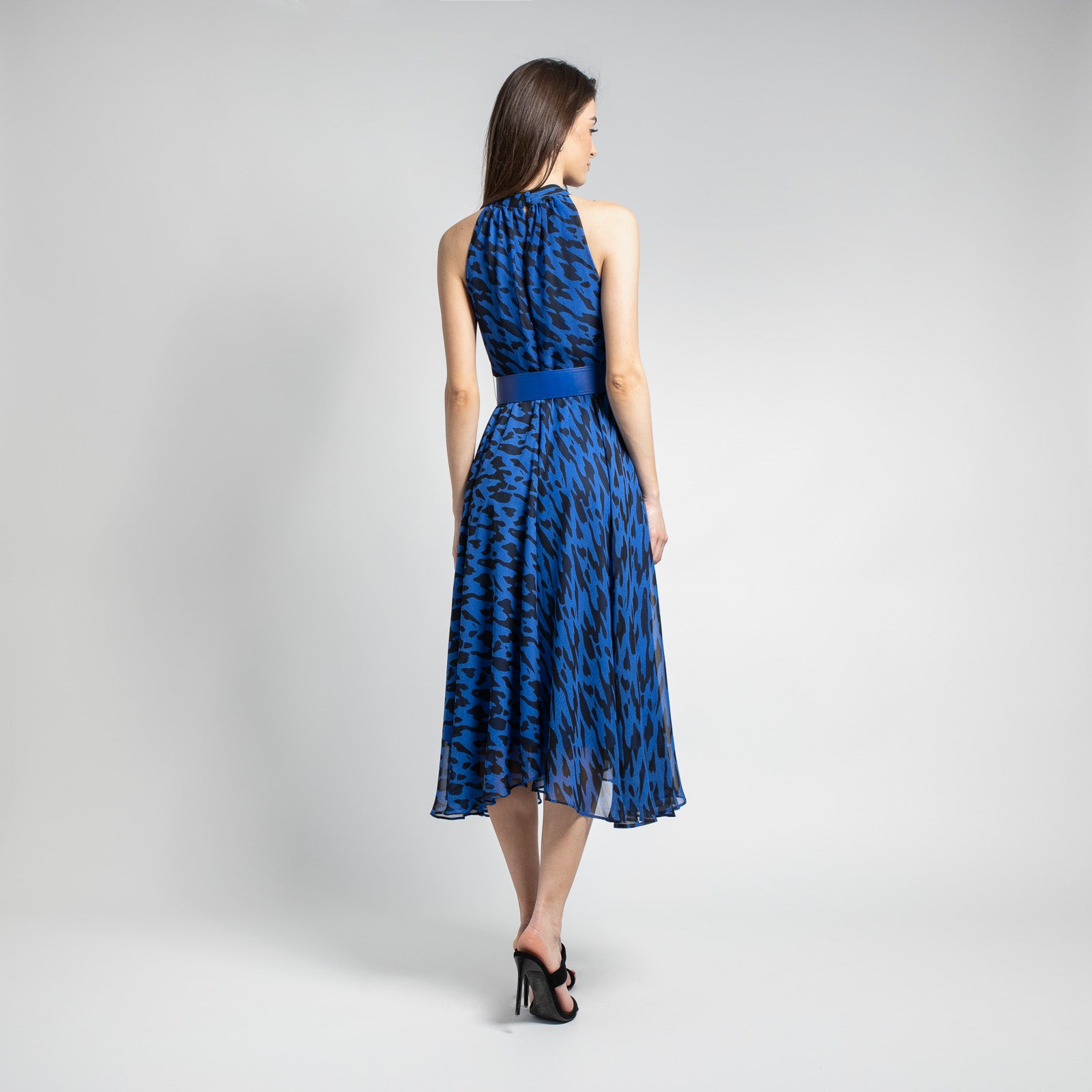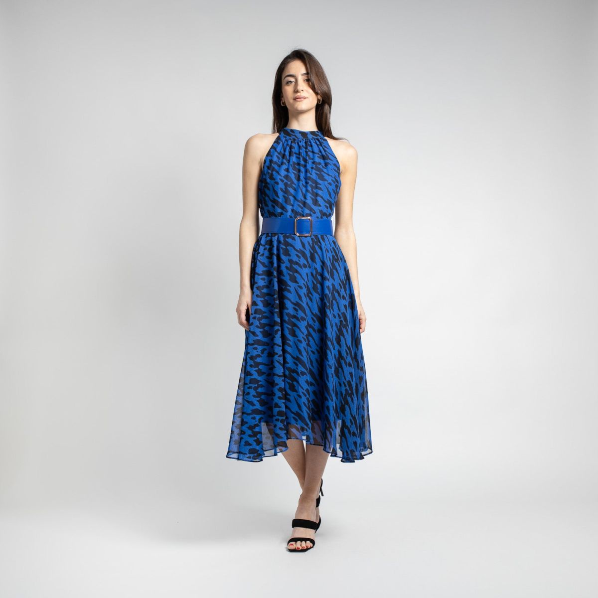 Midi αμάνικο φόρεμα με κλειστή λαιμόκοψη και ζώνη σε υπέροχο λεοπάρ σχέδιο. Διαθέτει εσωτερική φόδρα και πλούσιες πτυχές. Διαθέτει φερμουάρ και δύο κουμπάκια στο πίσω μέρος.