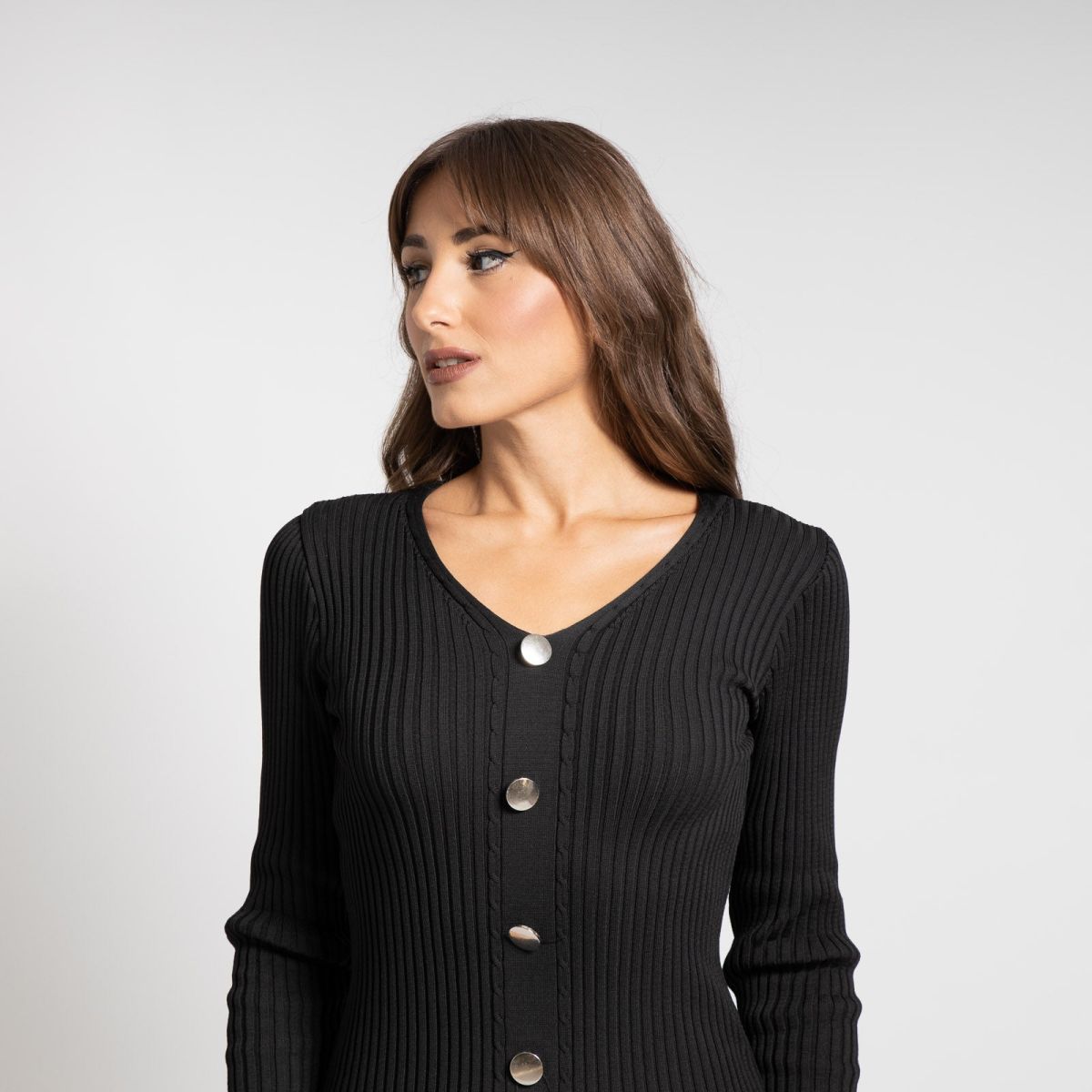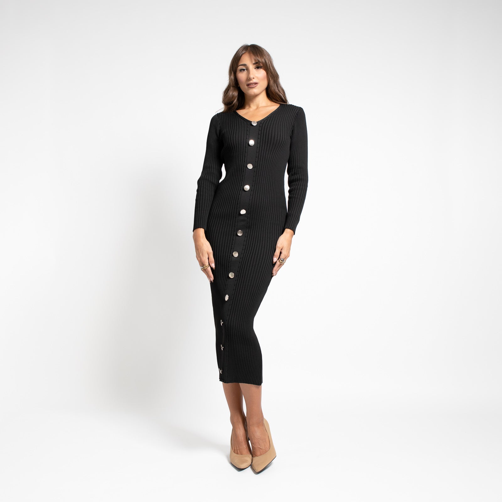 Δείξε την πιο κομψή εκδοχή του εαυτού σου με το Midi Πλεκτό Φόρεμα Με Κουμπιά Μαύρο!