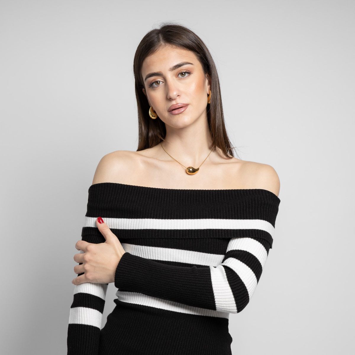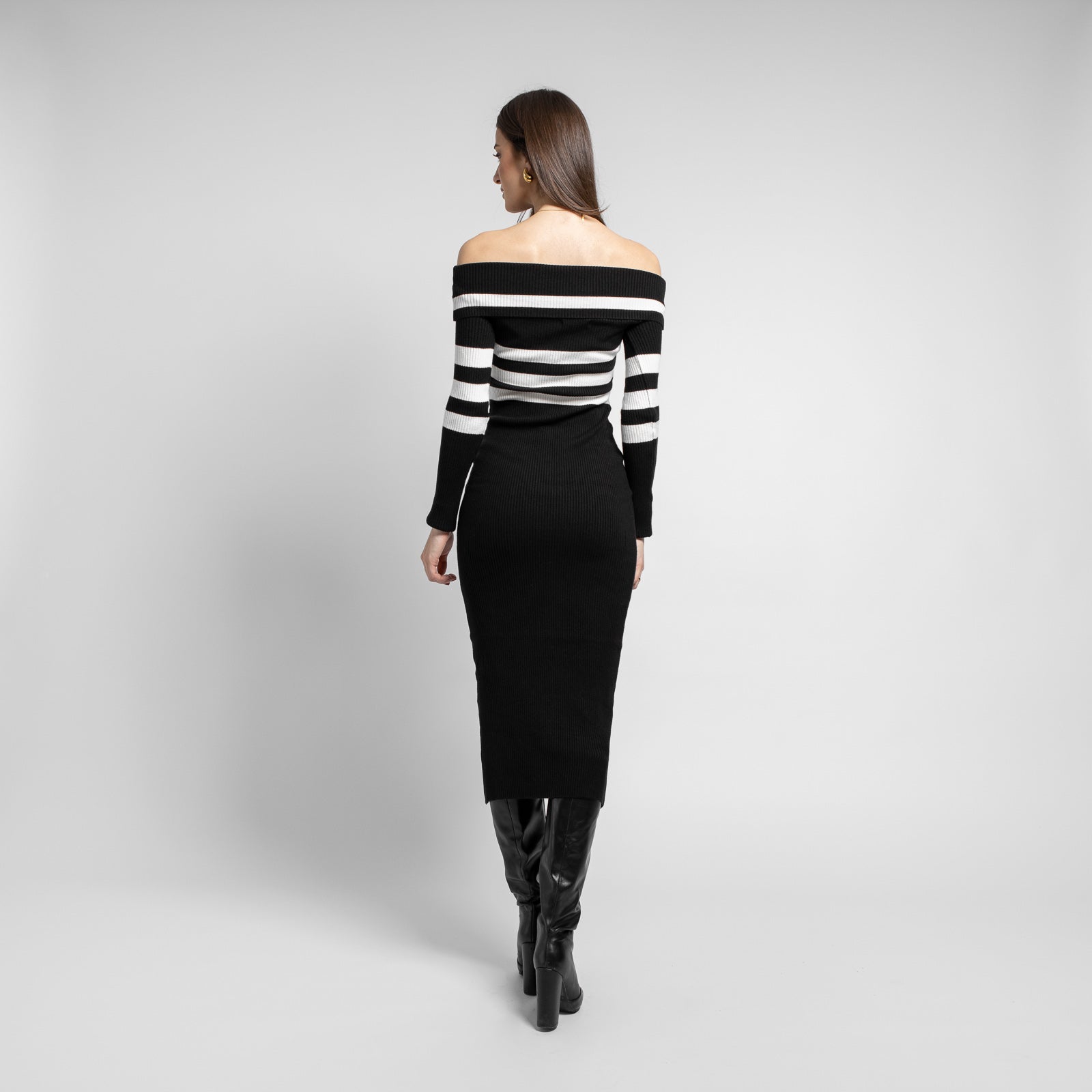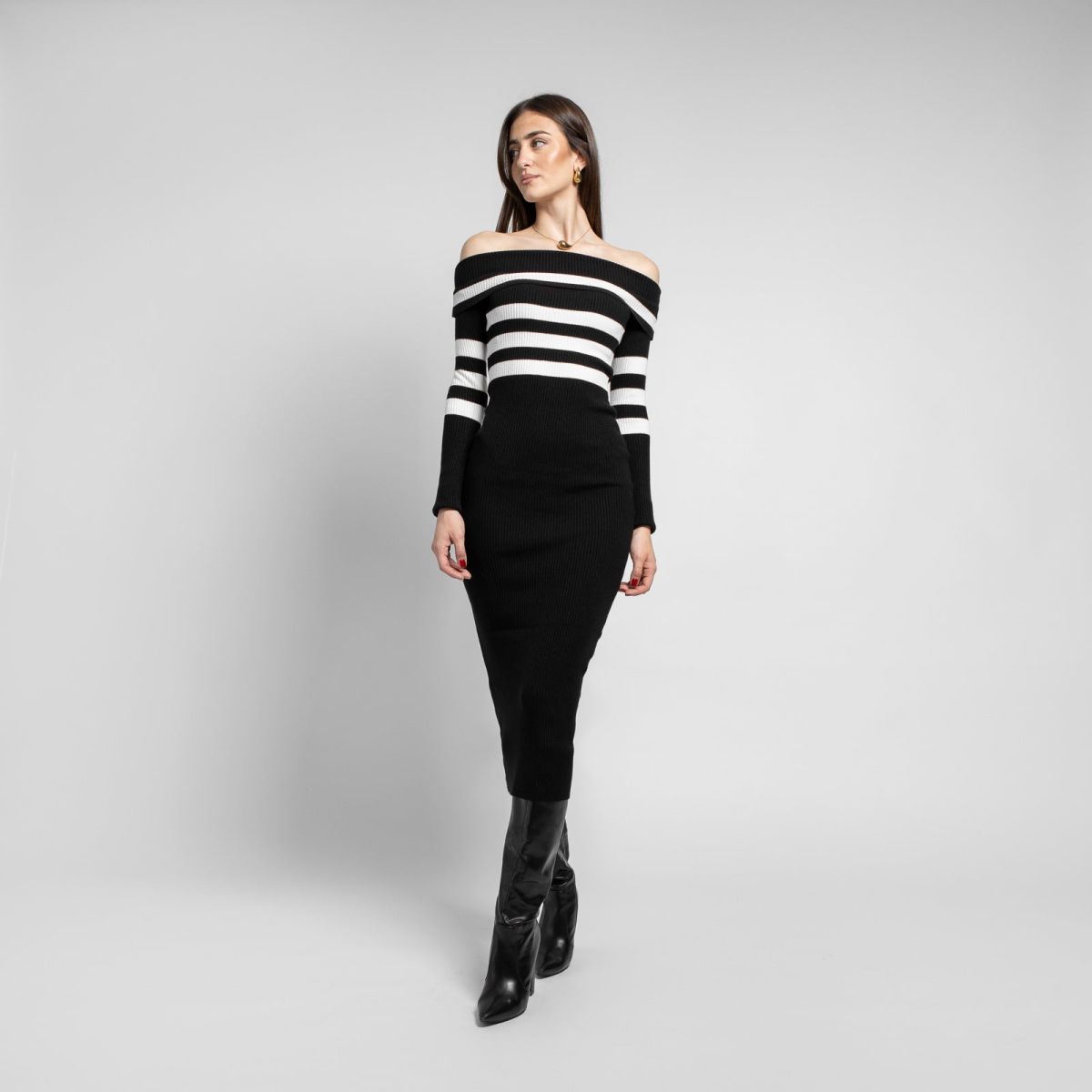 Πλεκτό strapless μακρύ φόρεμα ριγέ. Είναι πολύ ελαστικό. Το ριγέ σχέδιο είναι στα μανίκια και μέχρι την μέση.