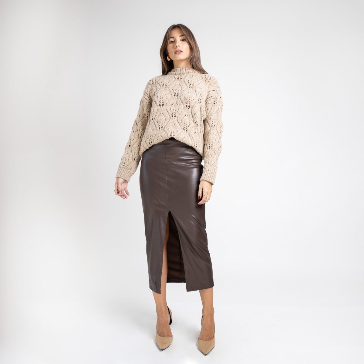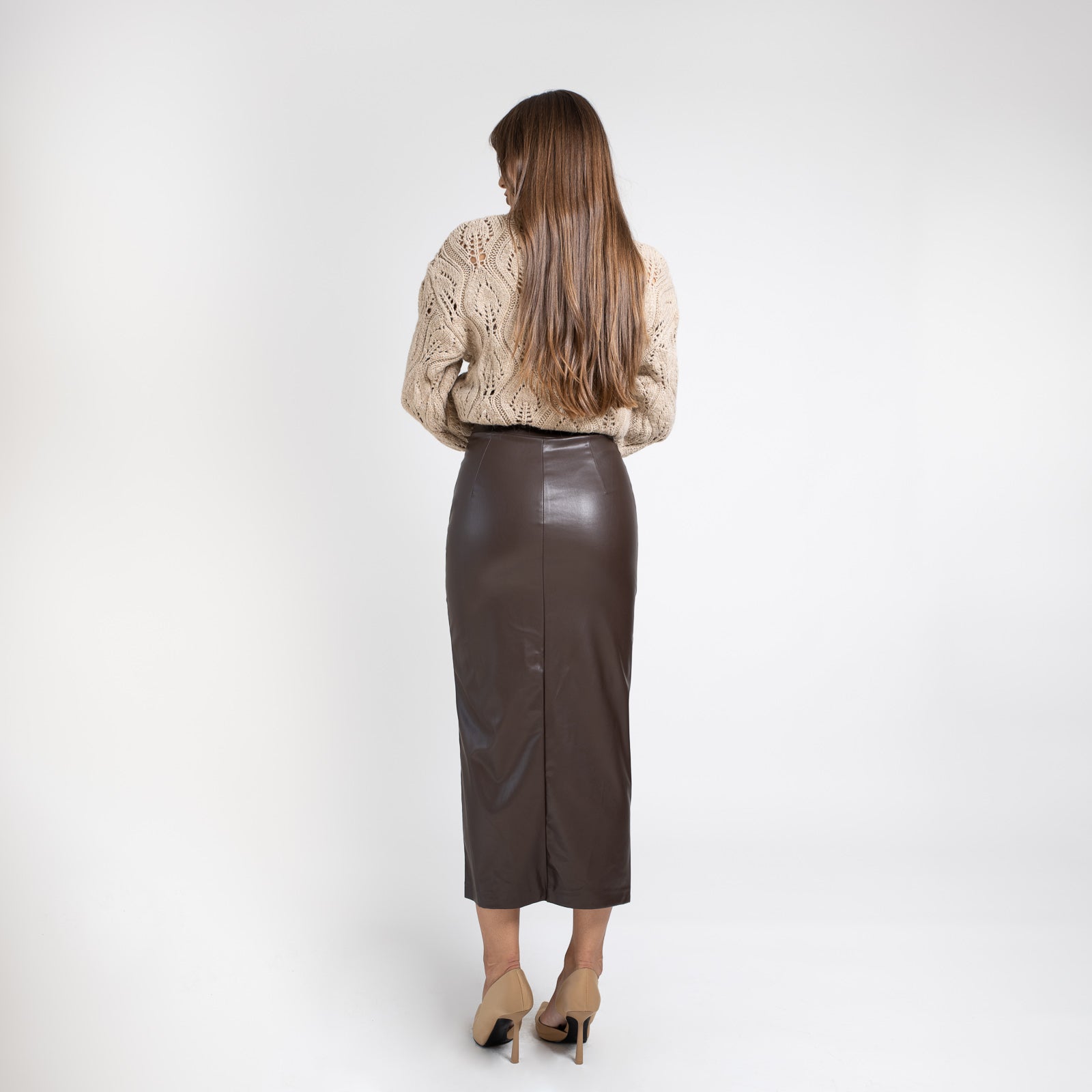 Δερμάτινη midi φούστα με σκίσιμο καφέ