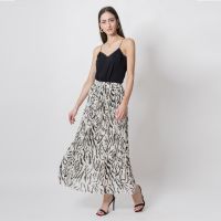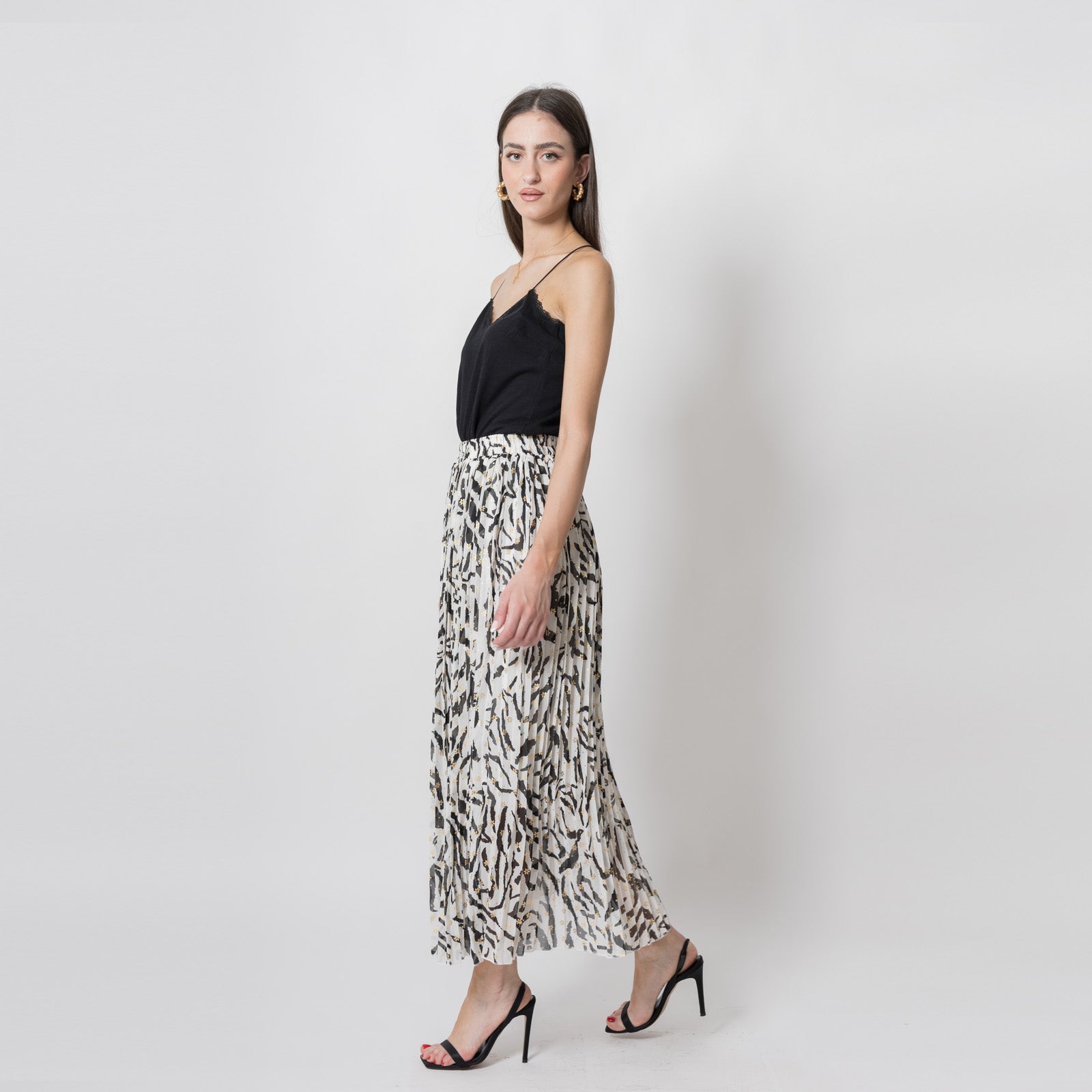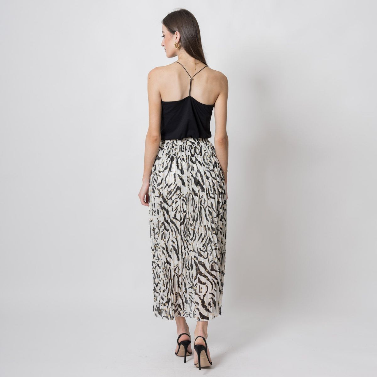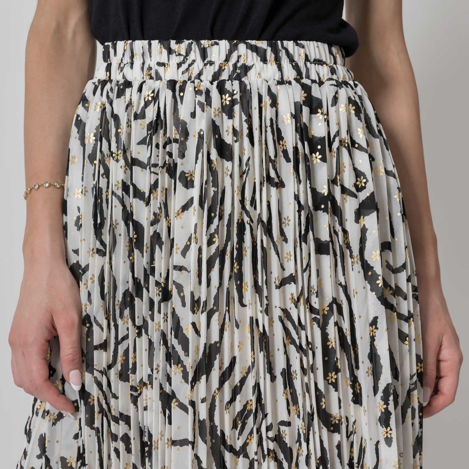 Μακριά φούστα πλισέ με λάστιχο στην μέση. Διαθέτει χρυσές λεπτομέρειες και σχέδιο ζέμπρας. Έχει εσωτερική φόδρα.