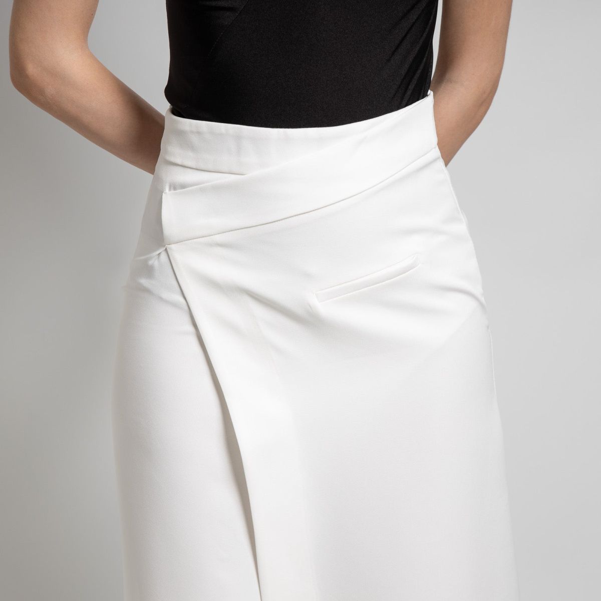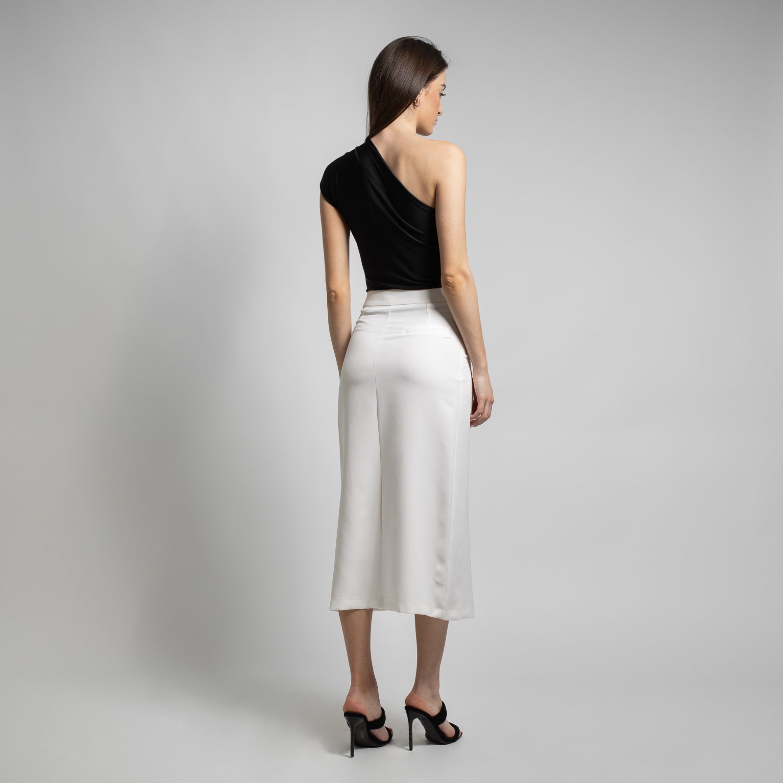Midi φούστα με πεσμένο φύλλο μπροστά. Κουμπώνει στο πλάι με φερμουάρ και έχει μία διακοσμητική τσέπη μπροστά και μία πίσω.