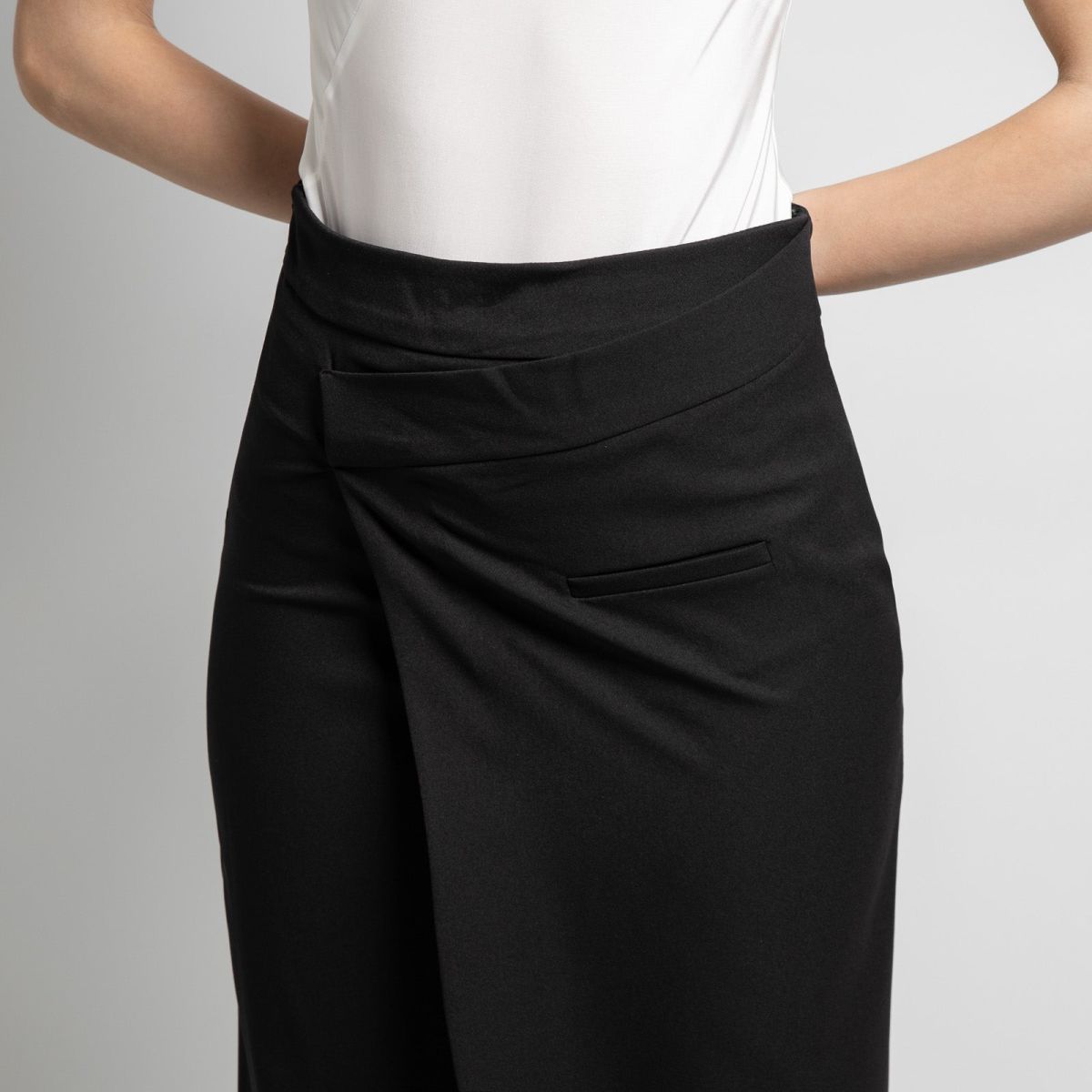 Midi φούστα με πεσμένο φύλλο μπροστά. Κουμπώνει στο πλάι με φερμουάρ και έχει μία διακοσμητική τσέπη μπροστά και μία πίσω.