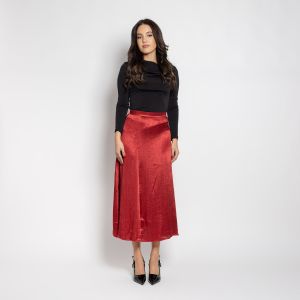 Η σατινέ υφή της προσφέρει διακριτική λάμψη και πολυτελή αίσθηση, ενώ η γραμμή Α αγκαλιάζει αρμονικά το σώμα χωρίς να πιέζει. Το midi μήκος κολακεύει τη σιλουέτα και κάνει τη φούστα εξαιρετικά ευέλικτη: φοριέται από το πρωί στο γραφείο μέχρι το βράδυ σε πιο επίσημες εμφανίσεις.