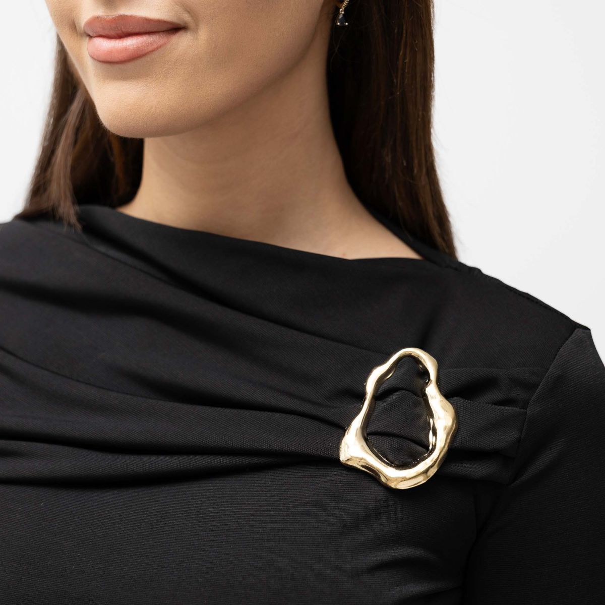 Το draped κόψιμο αγκαλιάζει απαλά το σώμα, ενώ ο χρυσός μεταλλικός κρίκος στο στήθος δημιουργεί ένα εφέ πολυτέλειας που τραβάει τα βλέμματα με διακριτικό τρόπο.
