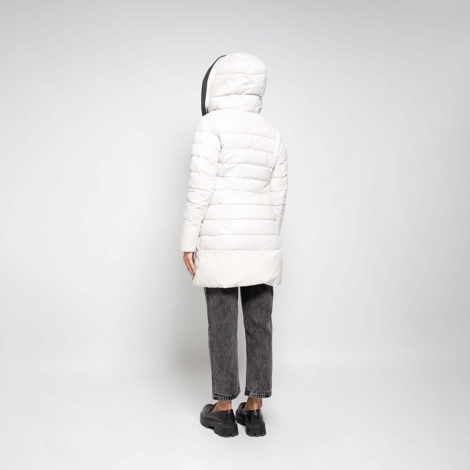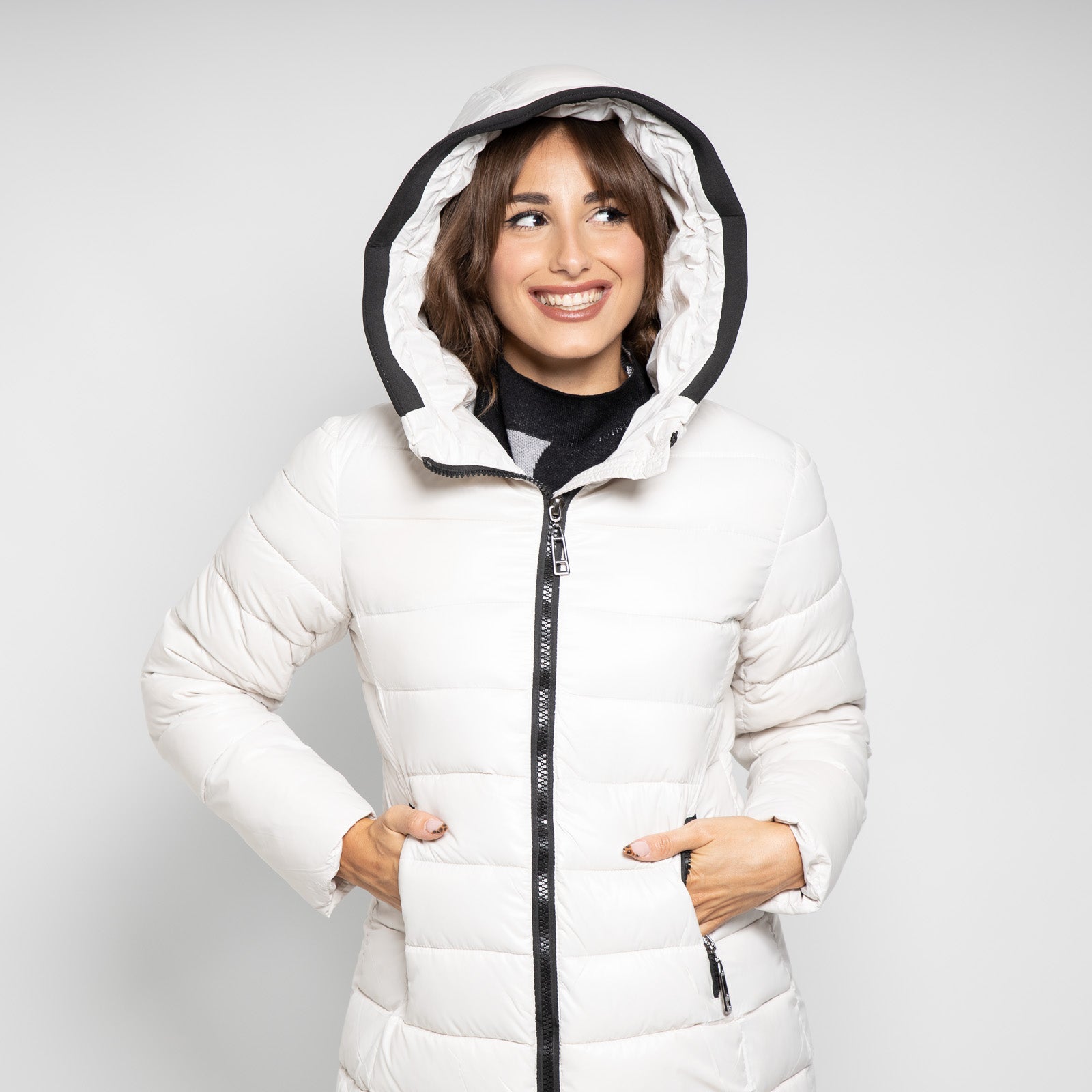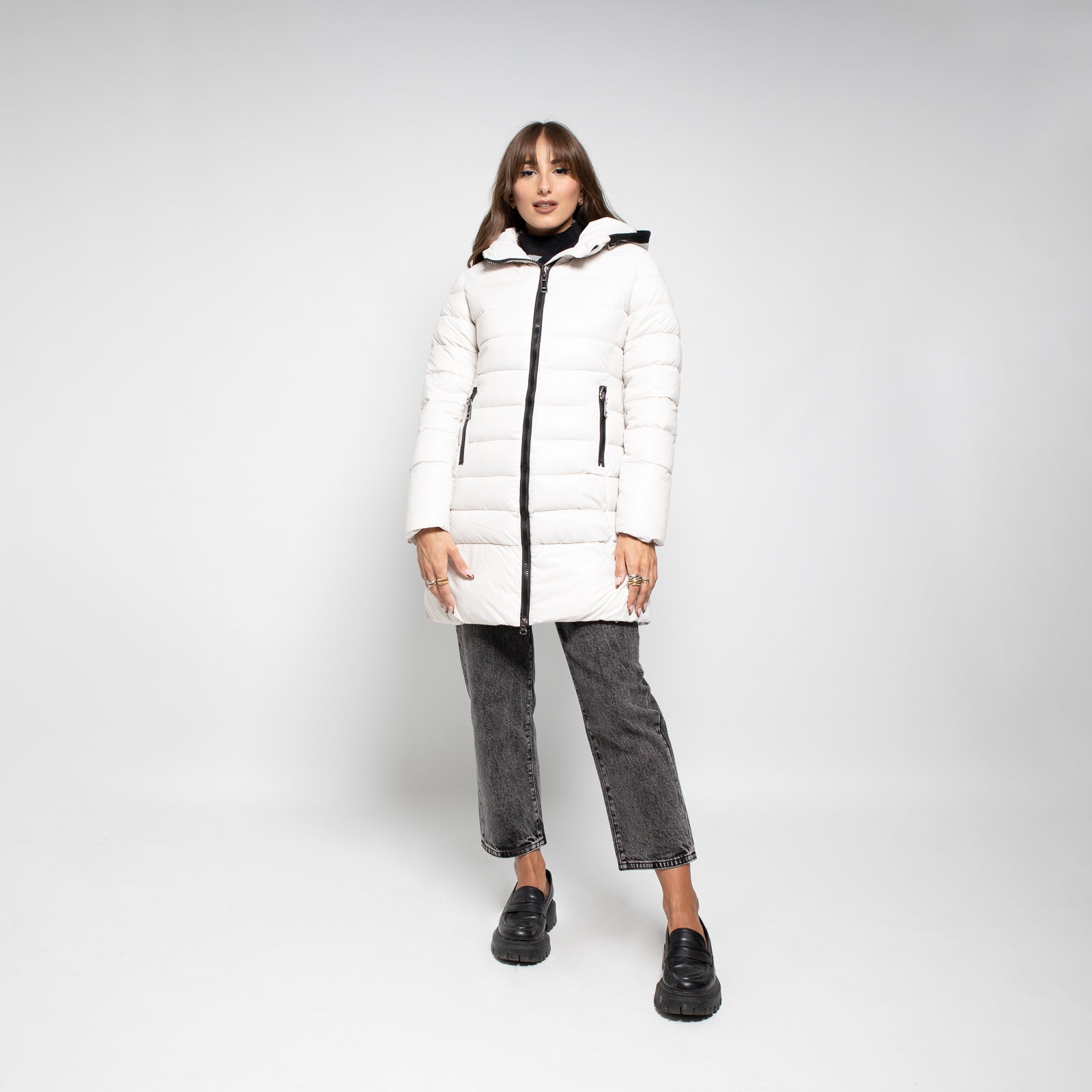 Μπουφάν με μοντέρνα, φουσκωτή γραμμή, κουκούλα που δεν αφαιρείται, μεσαίο μήκος που ταιριάζει σε κάθε σωματότυπο και τσέπες με φερμουάρ για πρακτικότητα.