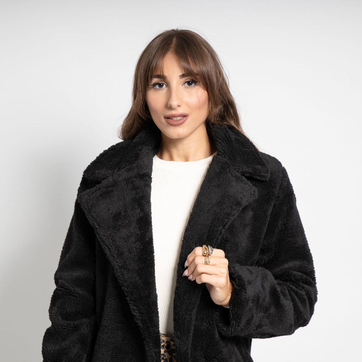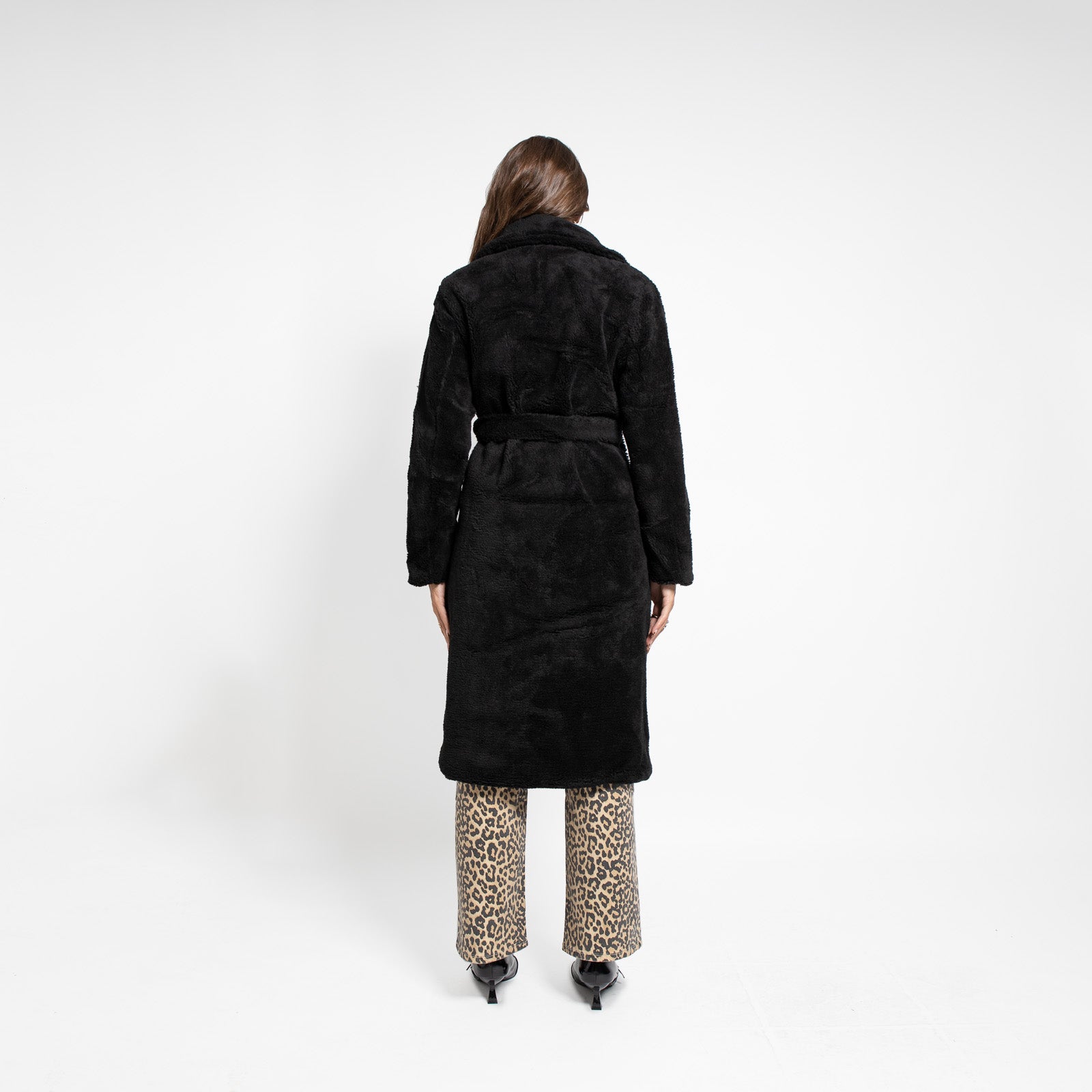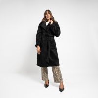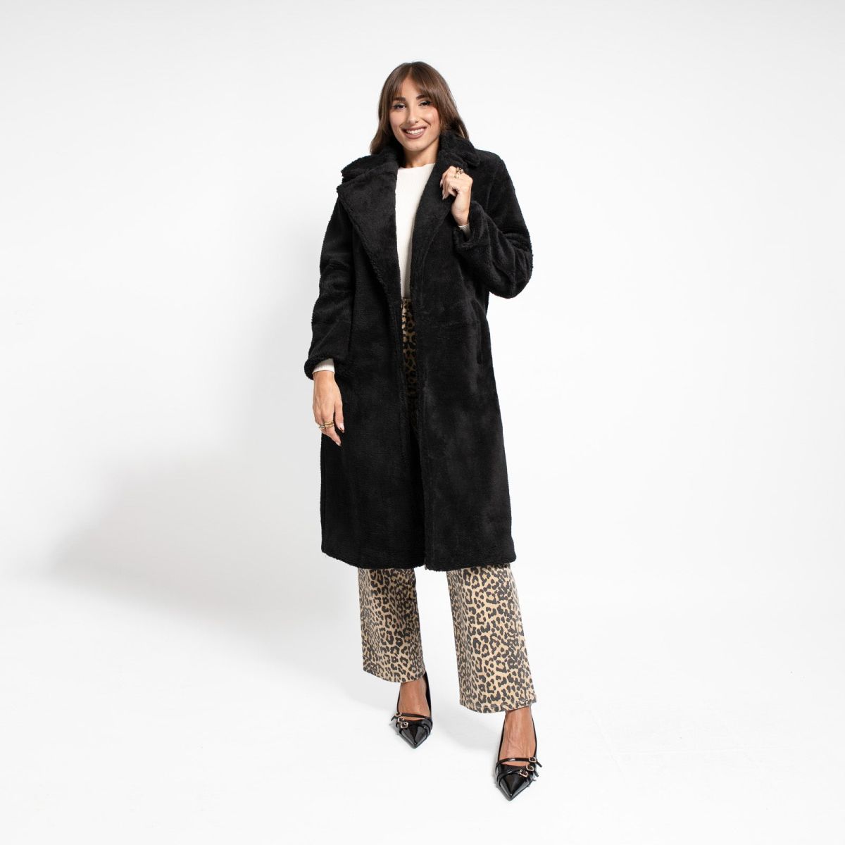 Παλτό με υφή σέρπα που θυμίζει μαλακό πρόβατο, κλασικό γιακά πέτο και ζώνη που τονίζει τη μέση και αναδεικνύει τη σιλουέτα.