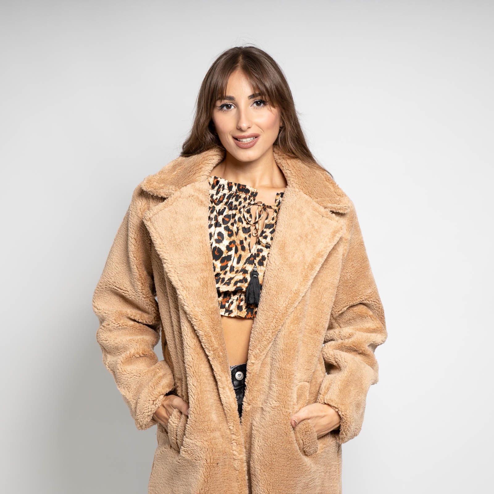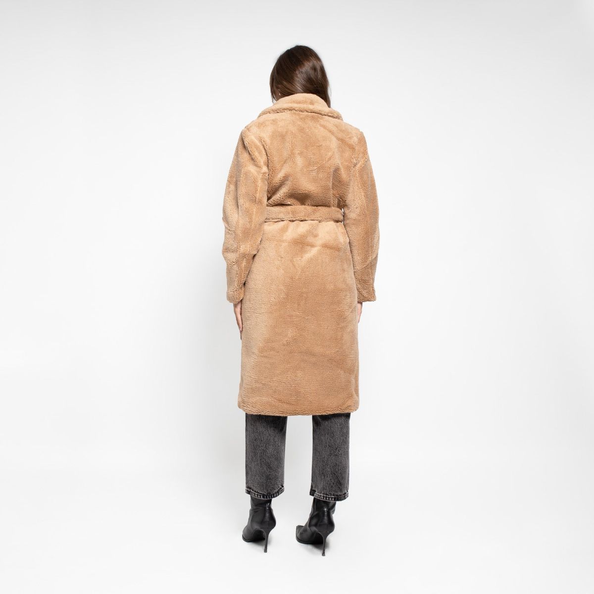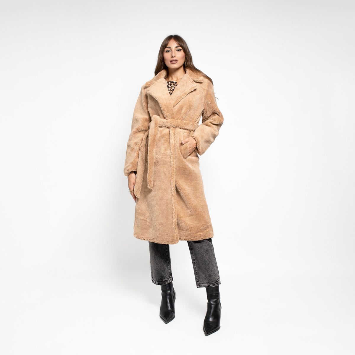 Παλτό με υφή σέρπα που θυμίζει μαλακό πρόβατο, κλασικό γιακά πέτο και ζώνη που τονίζει τη μέση και αναδεικνύει τη σιλουέτα.