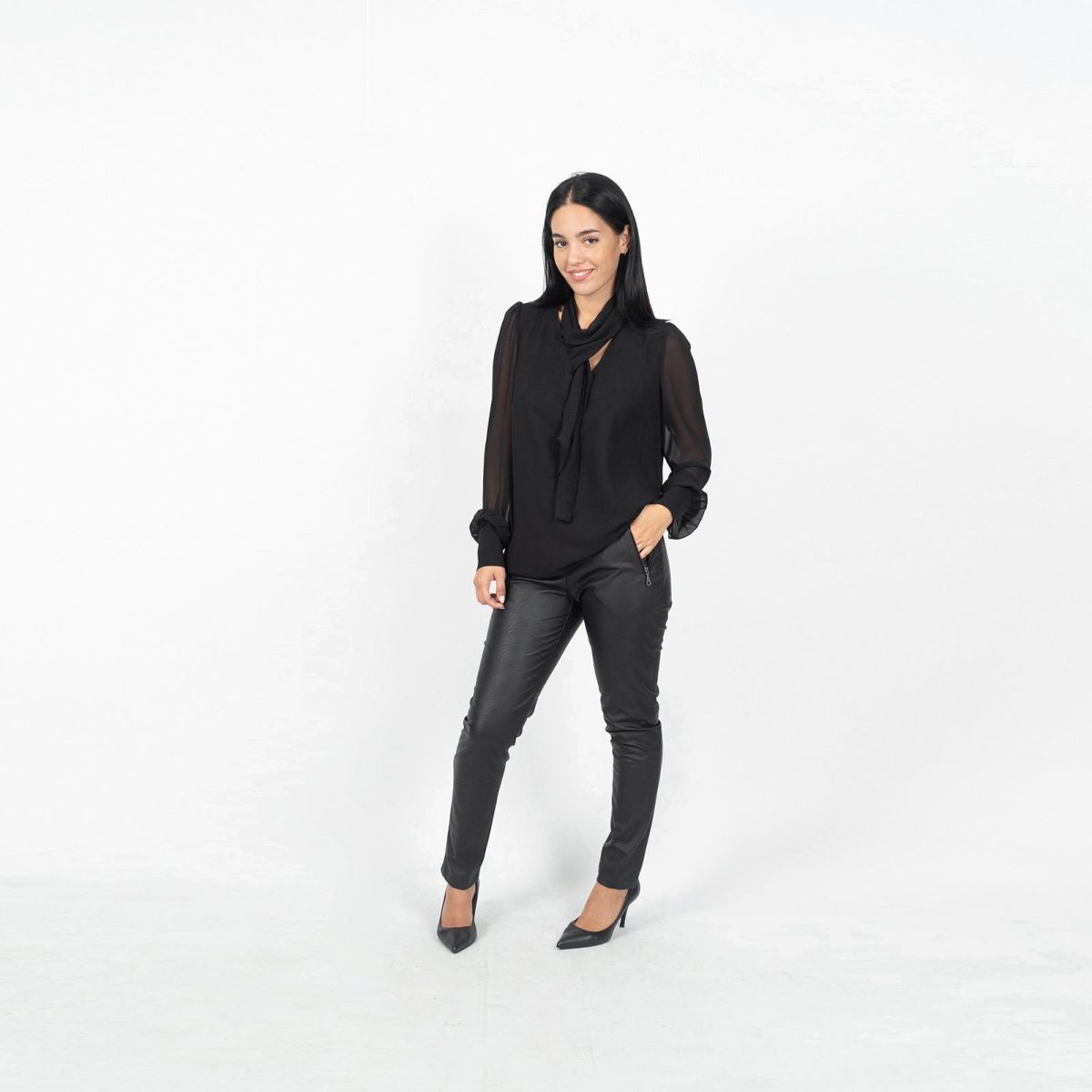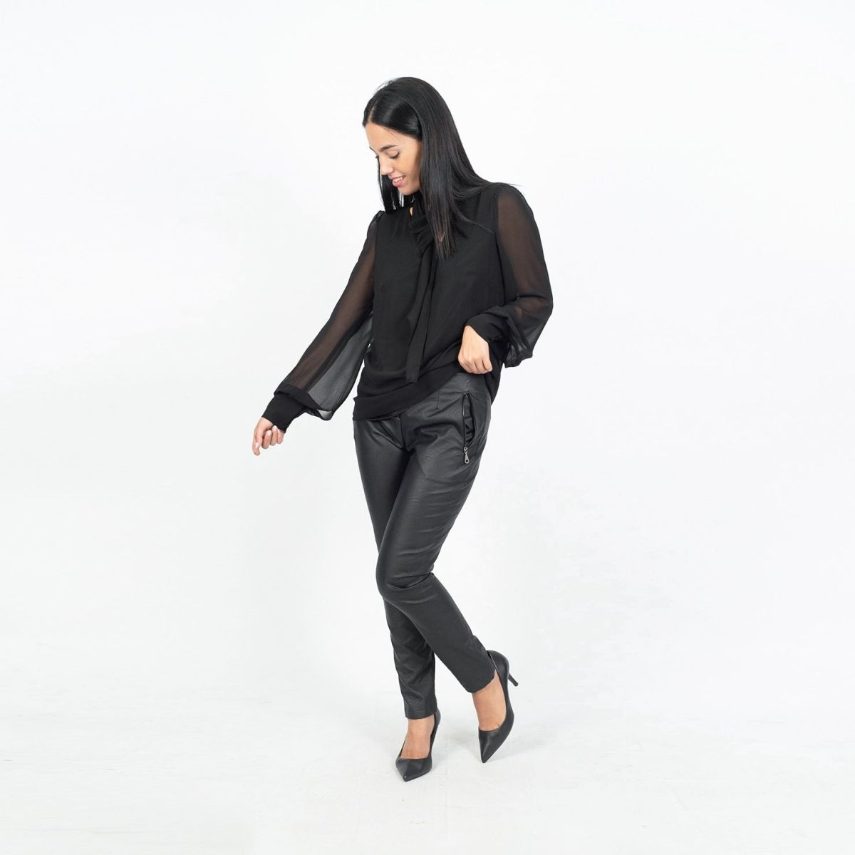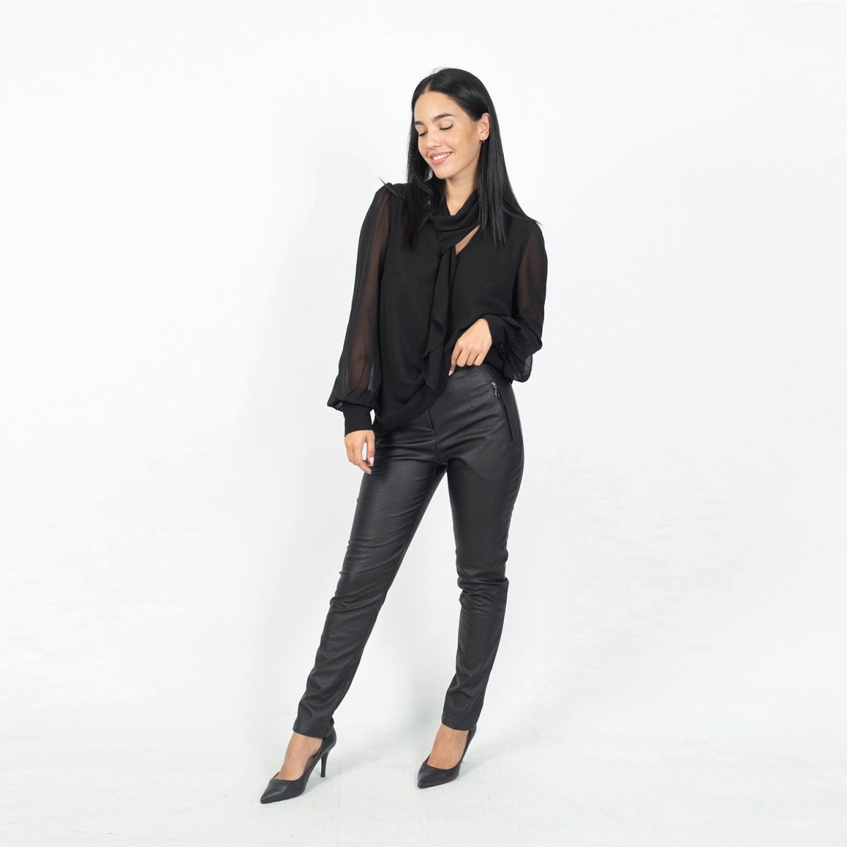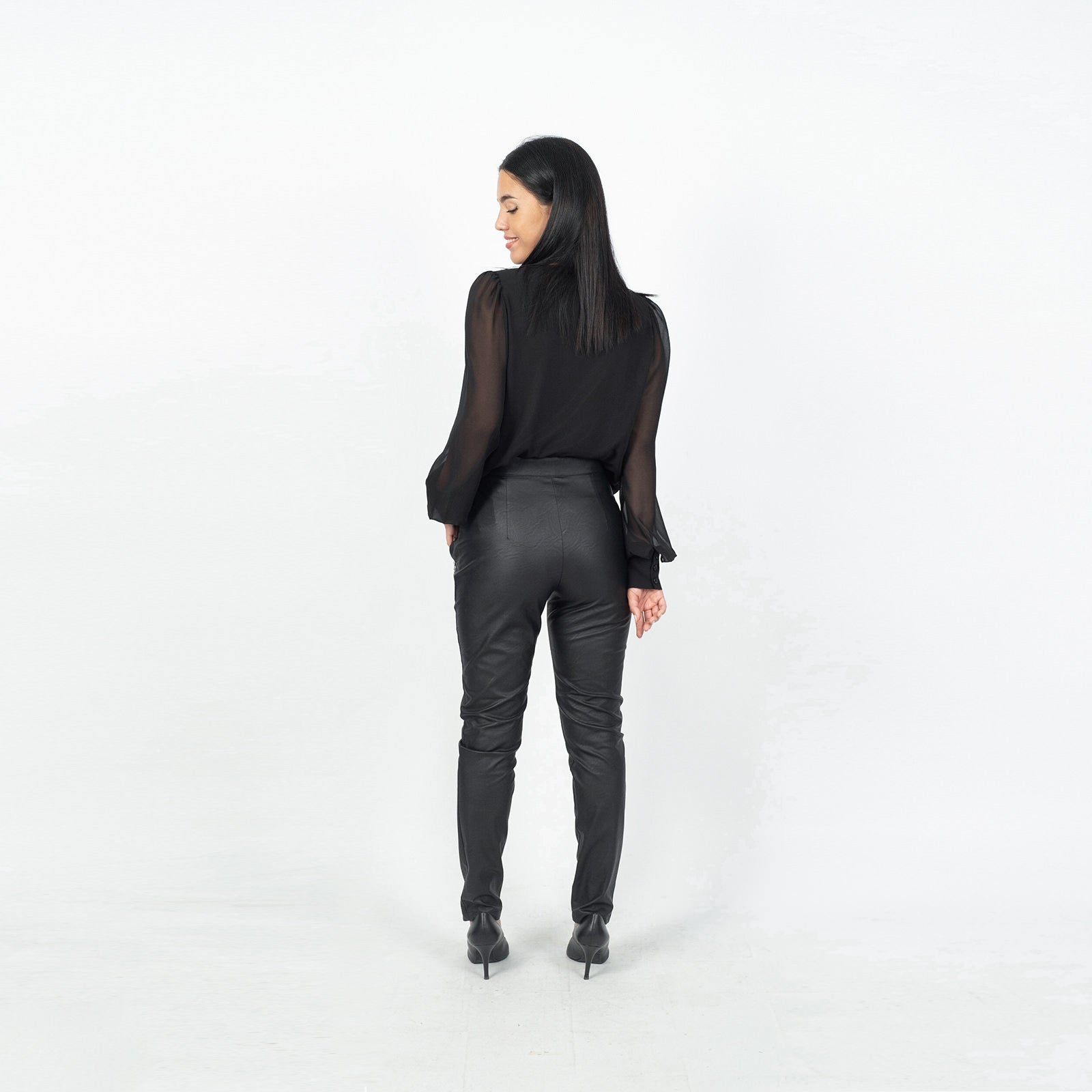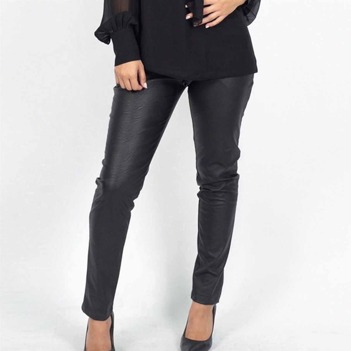 Παντελόνι σε ύφασμα δερματίνης σε ίσια γραμμή με μεταλλικά φερμουάρ στις τσέπες μπροστά. Η εσωτερική πλευρά της δερματίνης είναι 100%βισκόζ (φυσική) για να αναπνέει το δέρμα. 100% ελληνικής παραγωγής