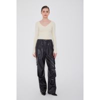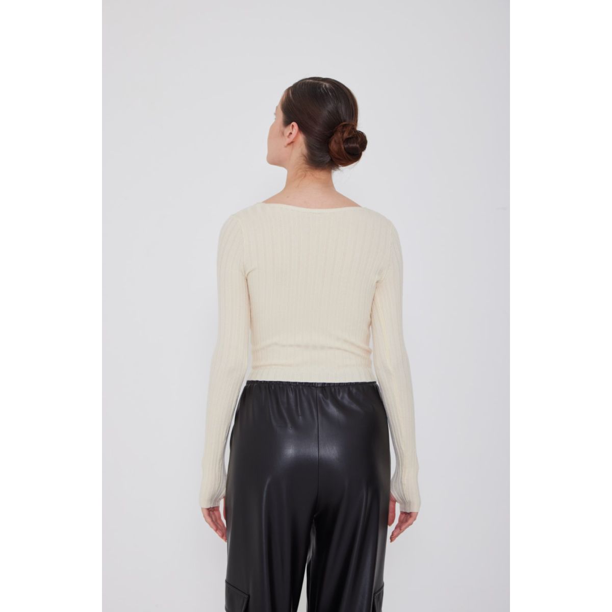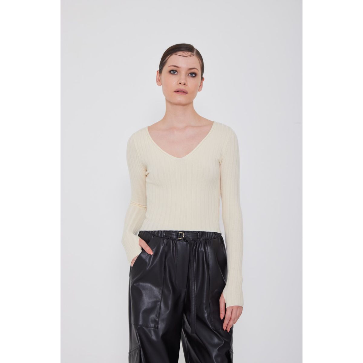 Πλεκτό κοντό μπλουζάκι με V και λεπτή πλέξη. Στο μανίκι υπάρχει άνοιγμα που μπορεί να χρησιμοποιηθεί σαν γάντι.