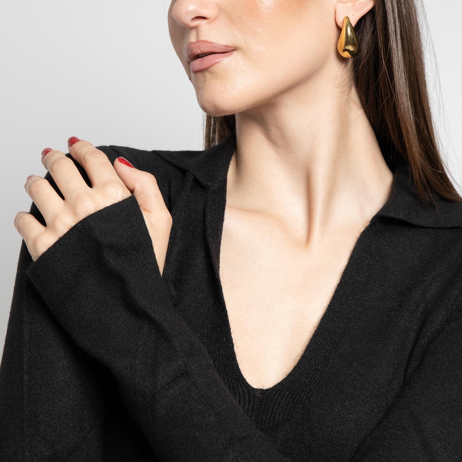 Η απαλή, ελαστική πλέξη του αγκαλιάζει το σώμα, ενώ το λάστιχο στο τελείωμα προσφέρει σταθερή εφαρμογή και όμορφη σιλουέτα. Τα μανίκια διαθέτουν ένα ελαφρύ σκίσιμο που δίνει την πιο ήσυχη αλλά καθόλου αδιάφορη λεπτομέρεια — ένα μικρό twist που κάνει το μπλουζάκι να ξεχωρίζει.