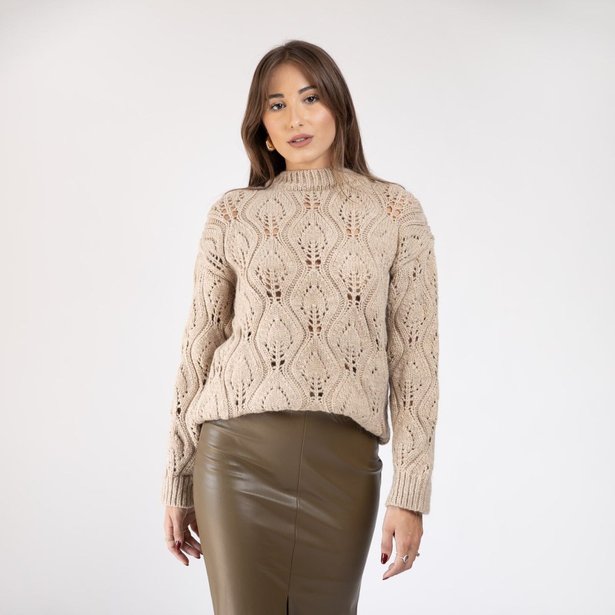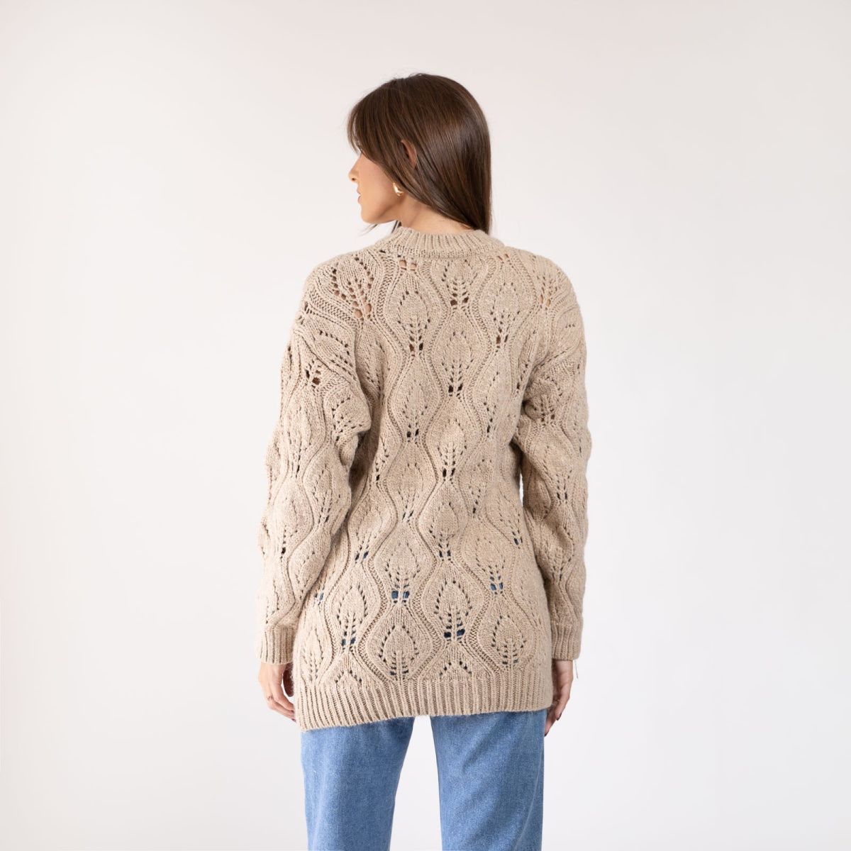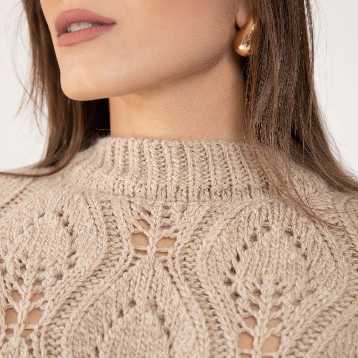 Πουλόβερ διάτρητο μακρυμάνικο με λαιμόκοψη μπέζ