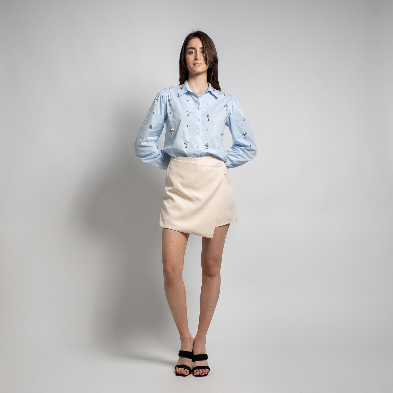 Μακρυμάνικο πουκάμισο διακοσμημένο με πετράδια και πτυχές στο μανίκι.