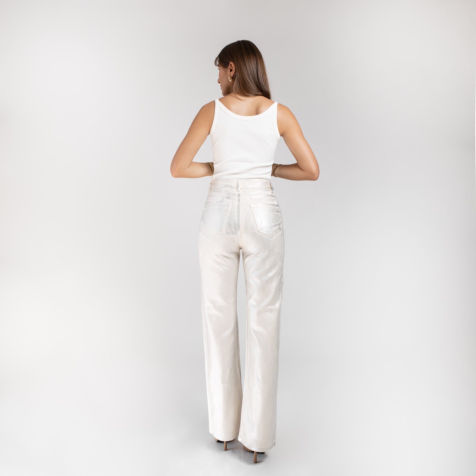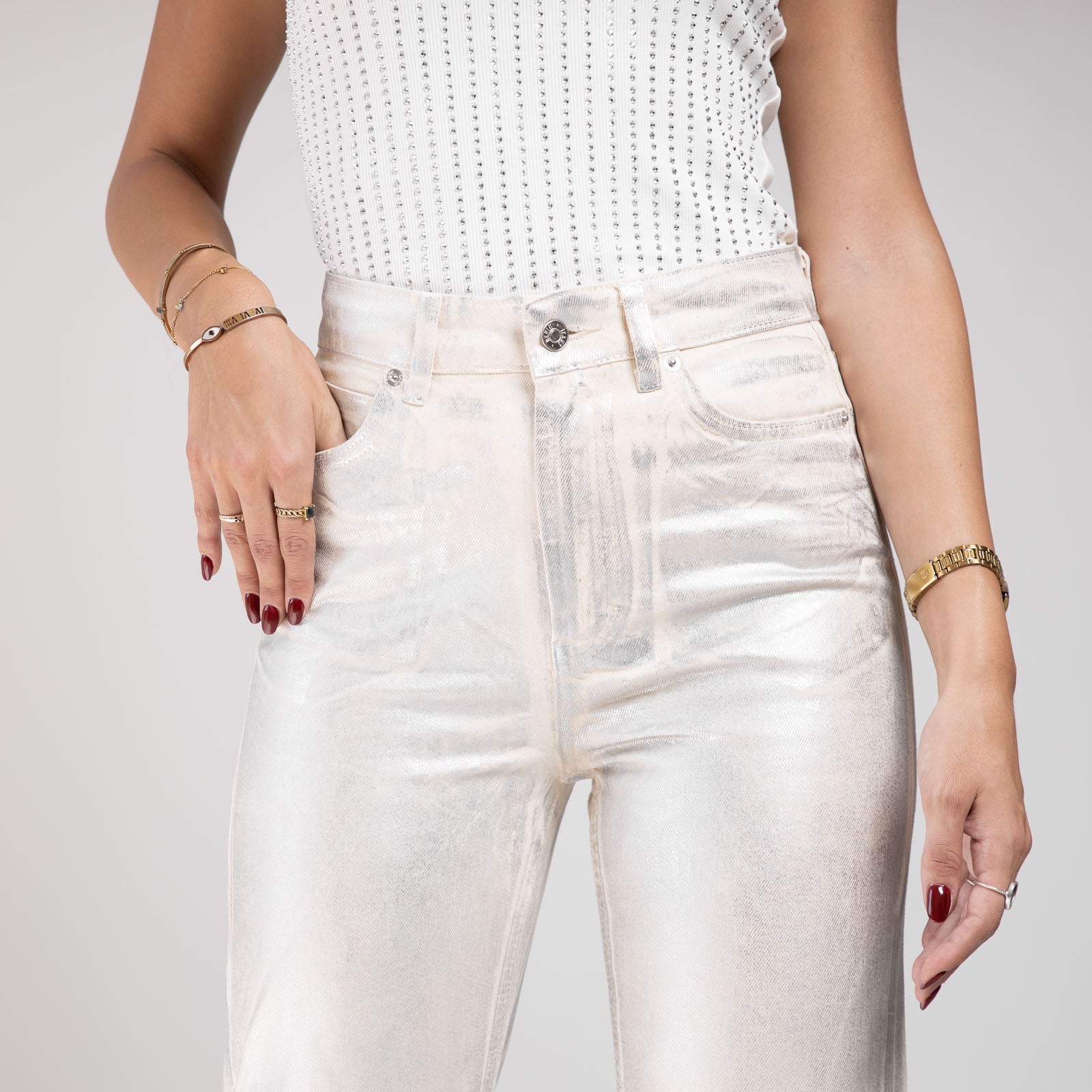 Jean παντελόνι με ασημί γυαλάδα και ελαφριά καμπάνα. Διαθέτει φερμουάρ και κουμπί, τσέπες μπροστά και πίσω.