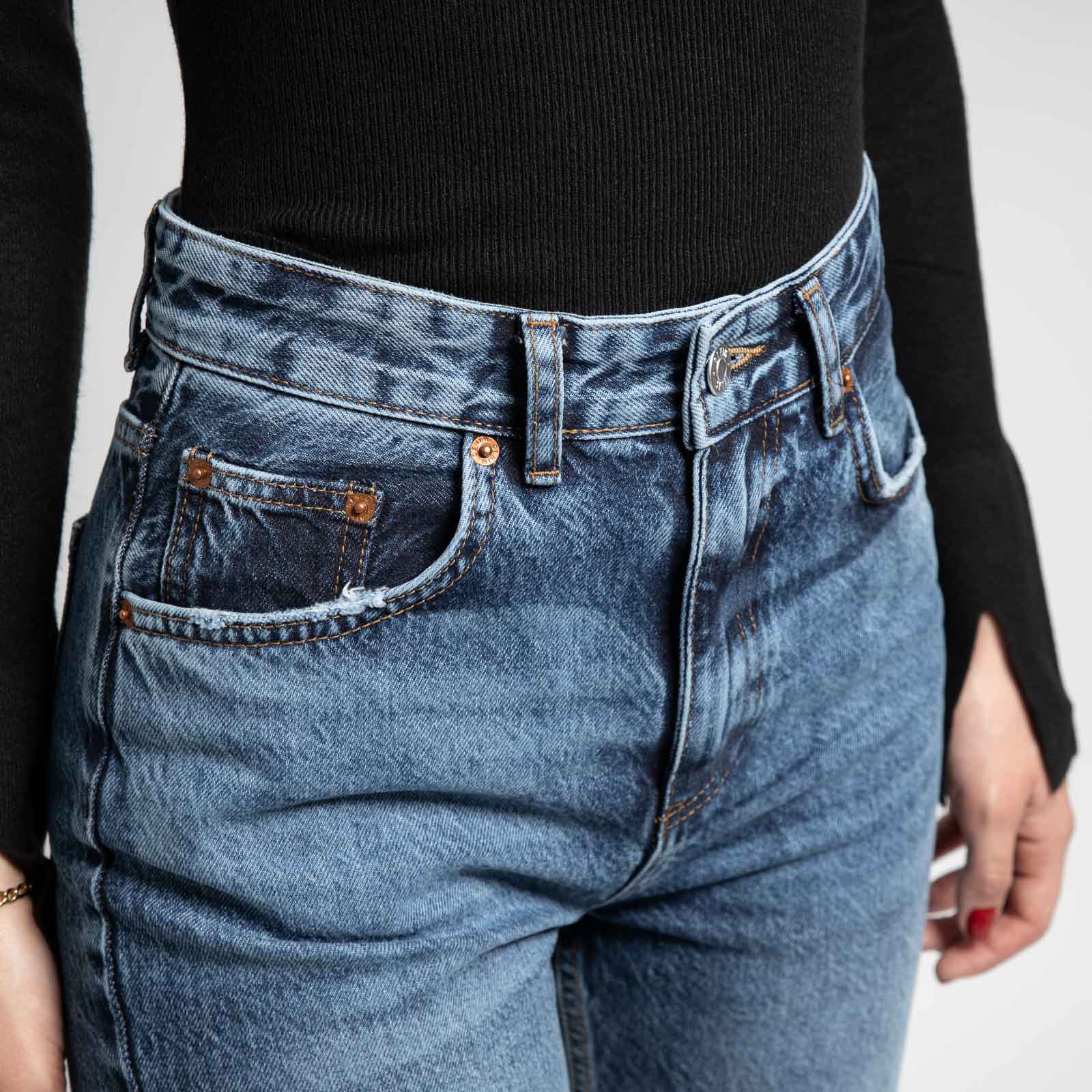 Jean mom fit πεντάτσεπο, που στενεύει στο τελείωμα, ελαφρώς «ξεβαμμένο».