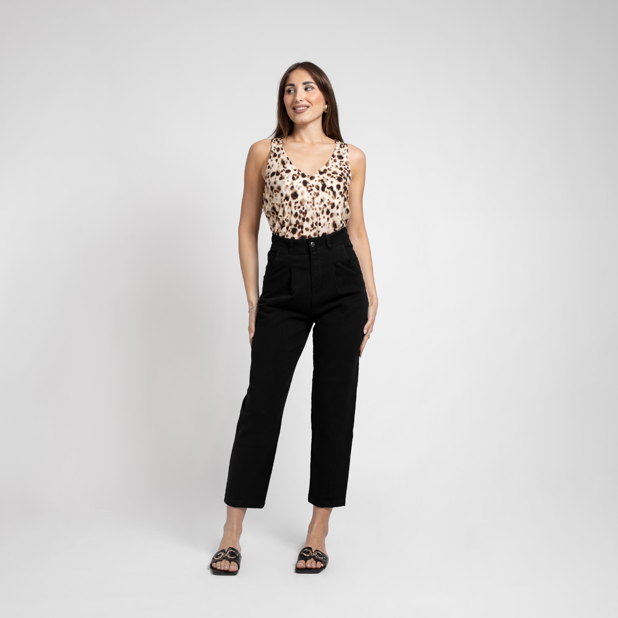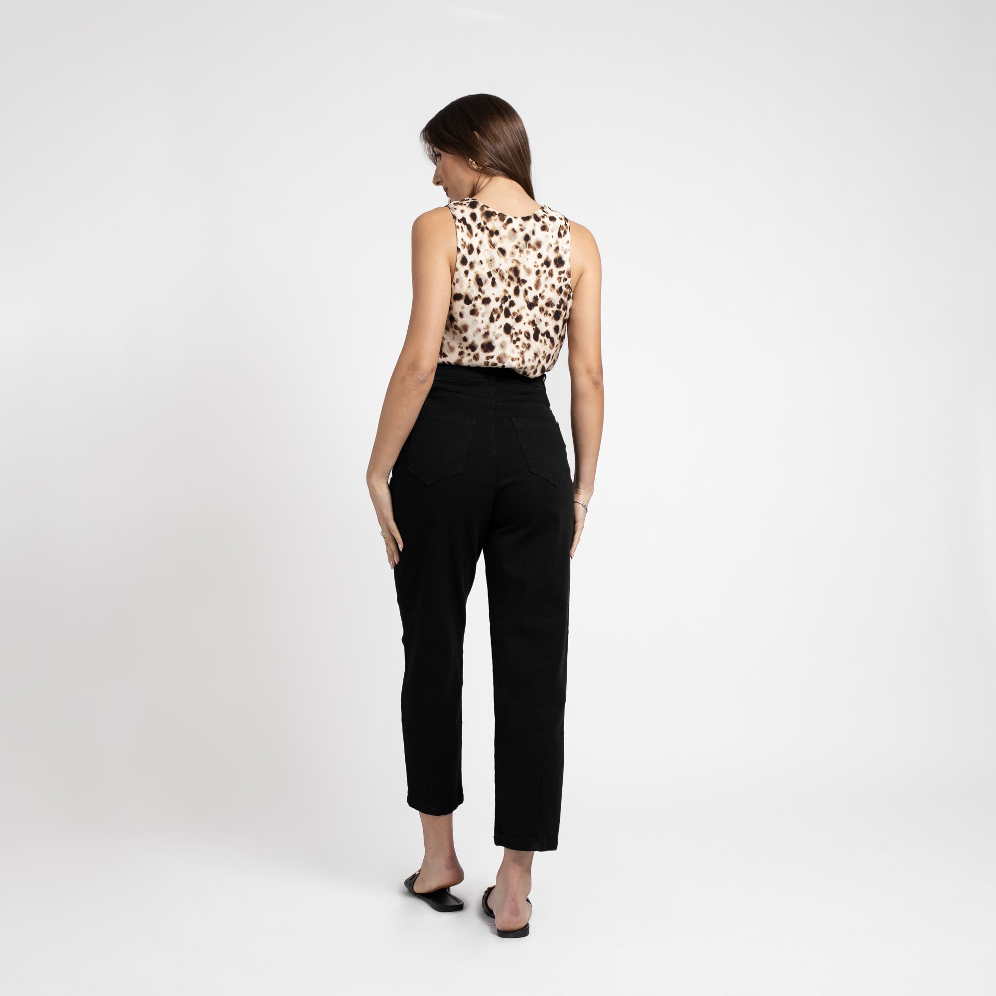 Το κοντό κωνικό μπατζάκι χαρίζει μοντέρνα πινελιά, ενώ η ψηλή μέση αναδεικνύει τη σιλουέτα και τονίζει τη θηλυκότητα.