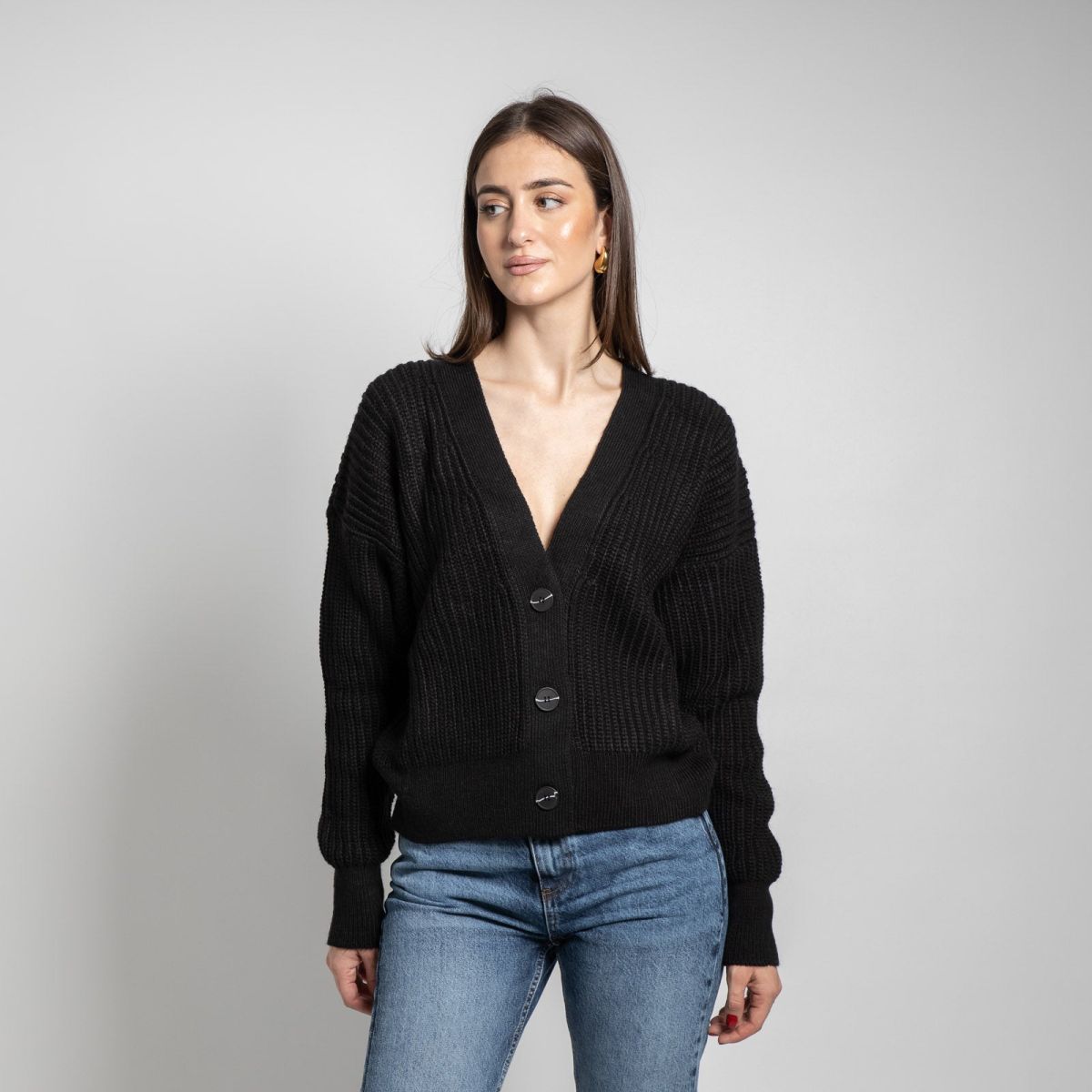 Πλεκτή κοντή ζακέτα με τρία κουμπιά και χοντρή πλέξη.