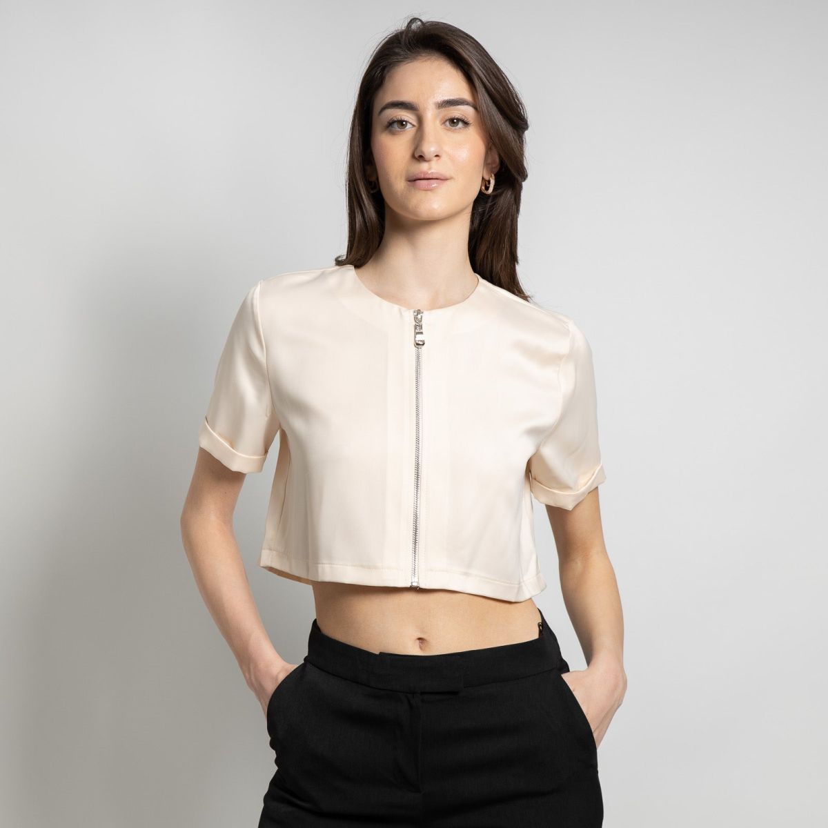 Σατέν Crop ζακετάκι με φερμουάρ. Είναι κοντομάνικο και έχει κλειστή λαιμόκοψη.