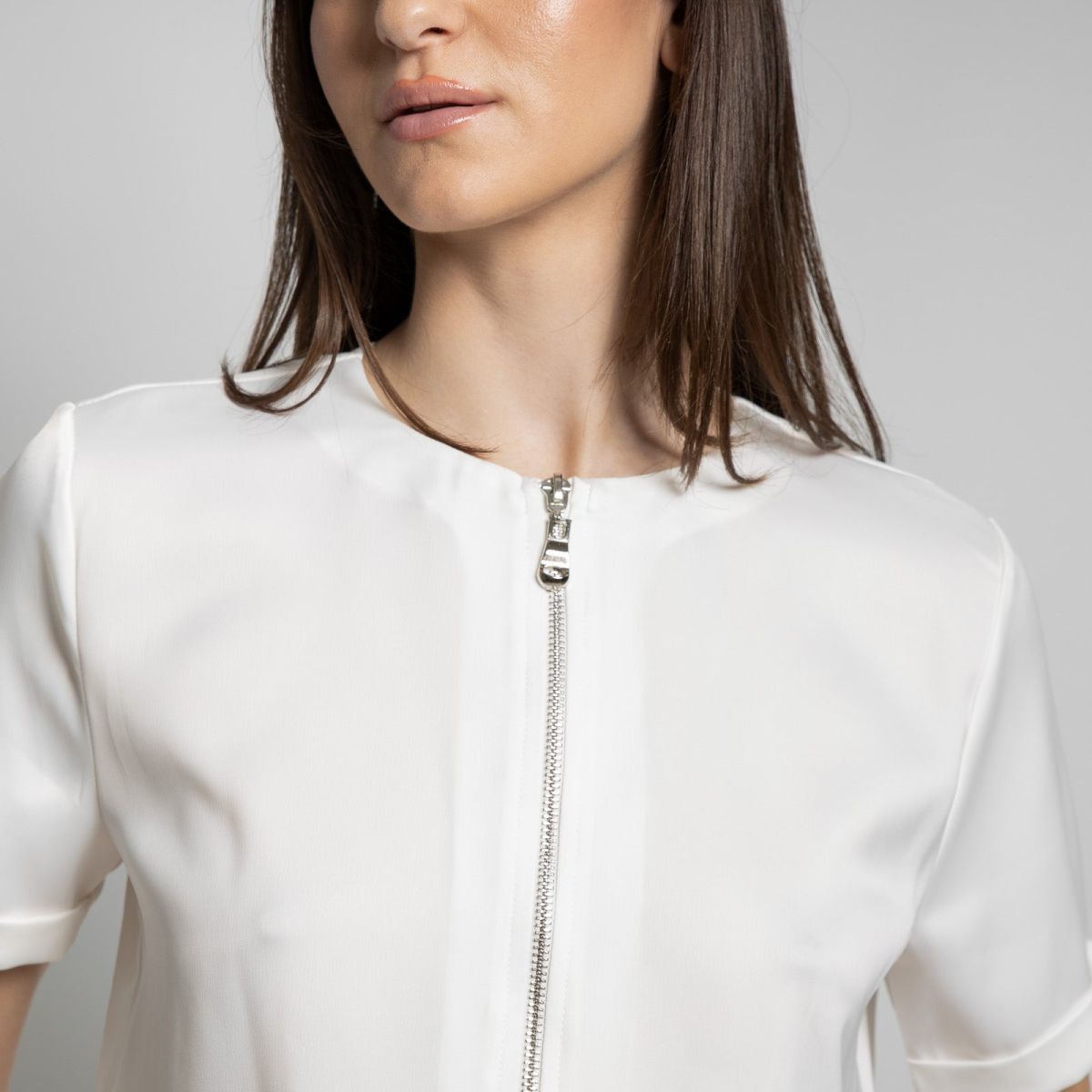 Σατέν Crop ζακετάκι με φερμουάρ. Είναι κοντομάνικο και έχει κλειστή λαιμόκοψη.